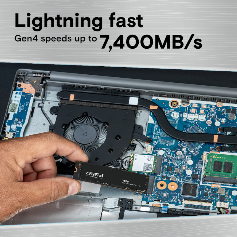 The Crucial T500 PCIe® Gen4 NVMe SSD will improve your gaming and content creation experience. The T500 is a game changer, designed for high-performance gaming, PS5 upgrades, and photo/video editing. With sequential read/write speeds of up to 7,300/6,800MB/s and random read/write speeds of up to 1.44M IOPs, you’ll be able to load games 16% faster and enjoy a 42% increase in content creation app performance.