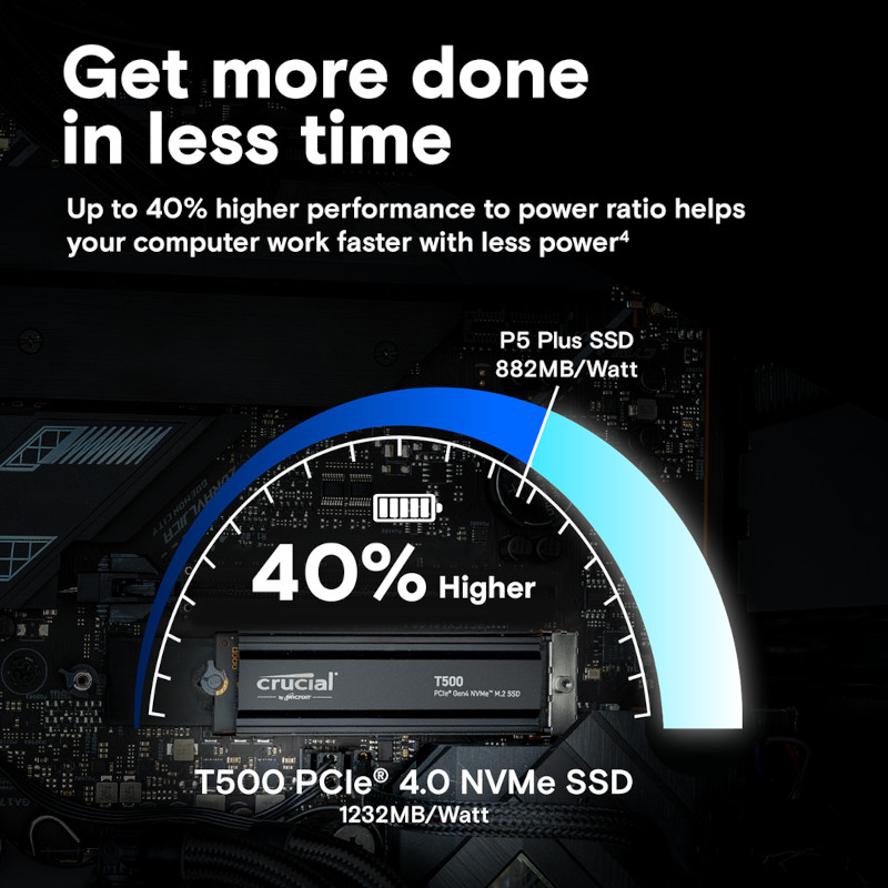 Experience a 40% increase in performance-to-power ratio, allowing your computer to work faster while using less power. With the Crucial T500 SSD, you can easily upgrade your system and enjoy the benefits of lightning-fast performance.
