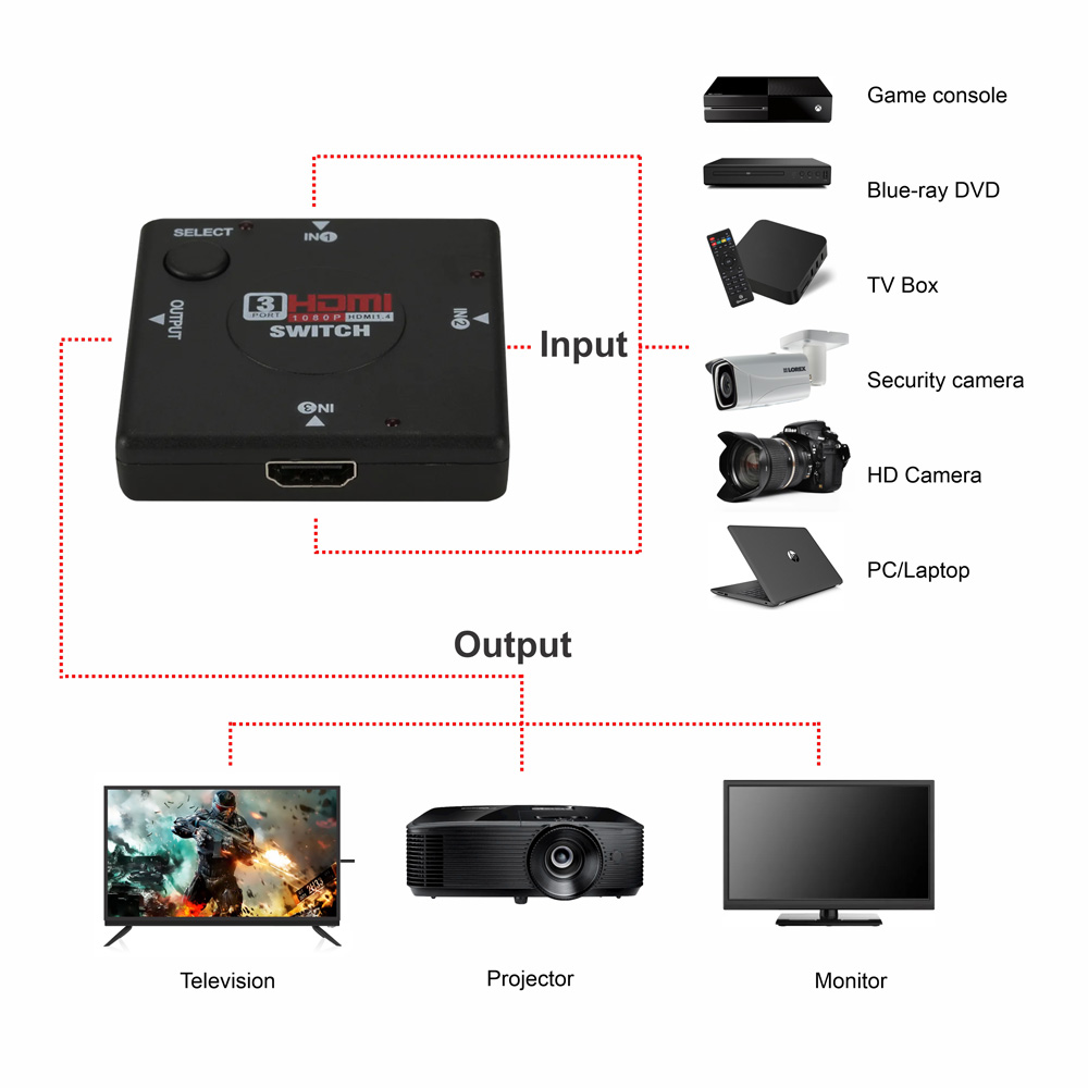 Switching methods: intelligent touch button. Supports highest video resolution 1080p, Support 3D – defines input/output protocols for major 3D video formats, paving the way for true 3D gaming and 3D home theatre applications Supports compressed audio such as DTS Digital, Dolby Digital(including DTS-HD and Dolby True HD)