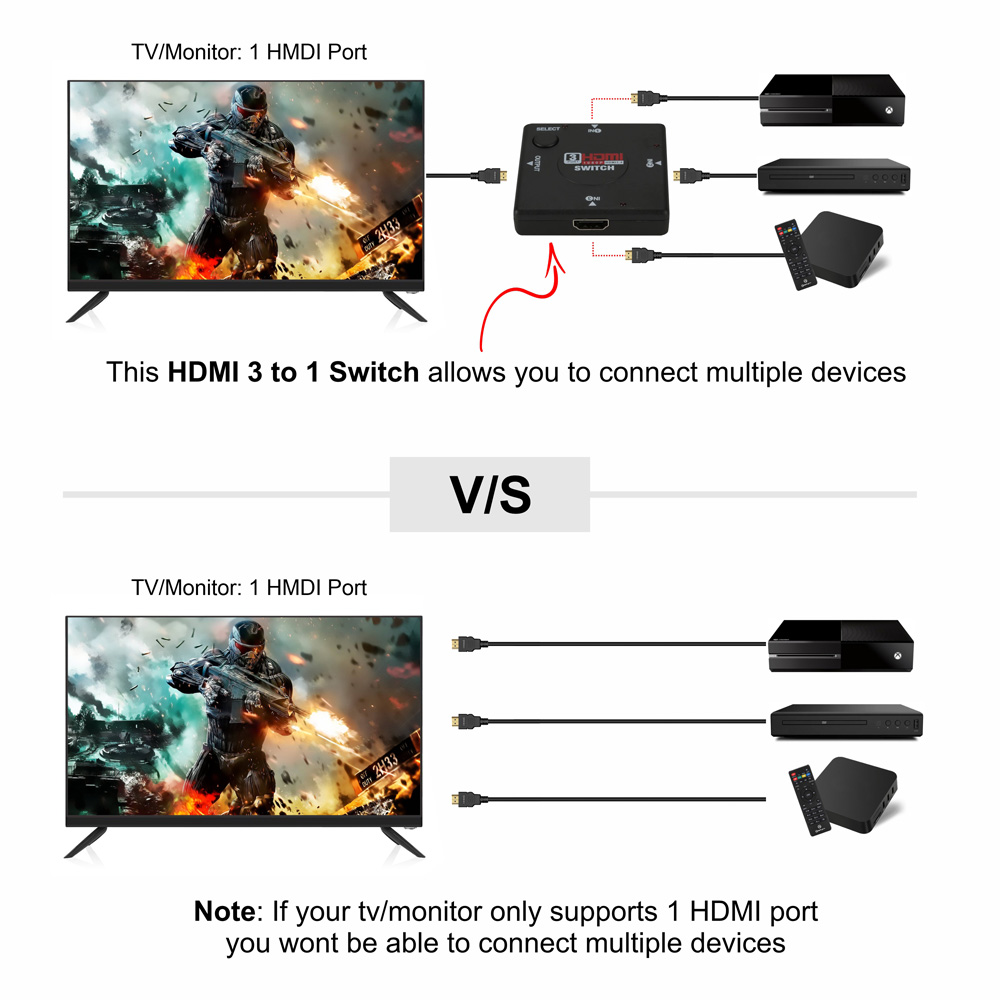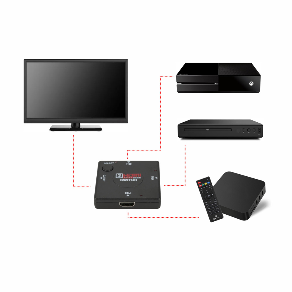 This is an intelligent HDMI* 3X1 Amplifier Switcher. It allows three HDMI* source devices switched into one HD monitor or projector. Adopted touch button design lets you enjoy the high technology and easy switching life. Quite different from other switchers, this intelligent Switcher has one input port on the front panel. This not only reduced the switcher to an ideal small size but also be more convenient for users to connect the source devices.