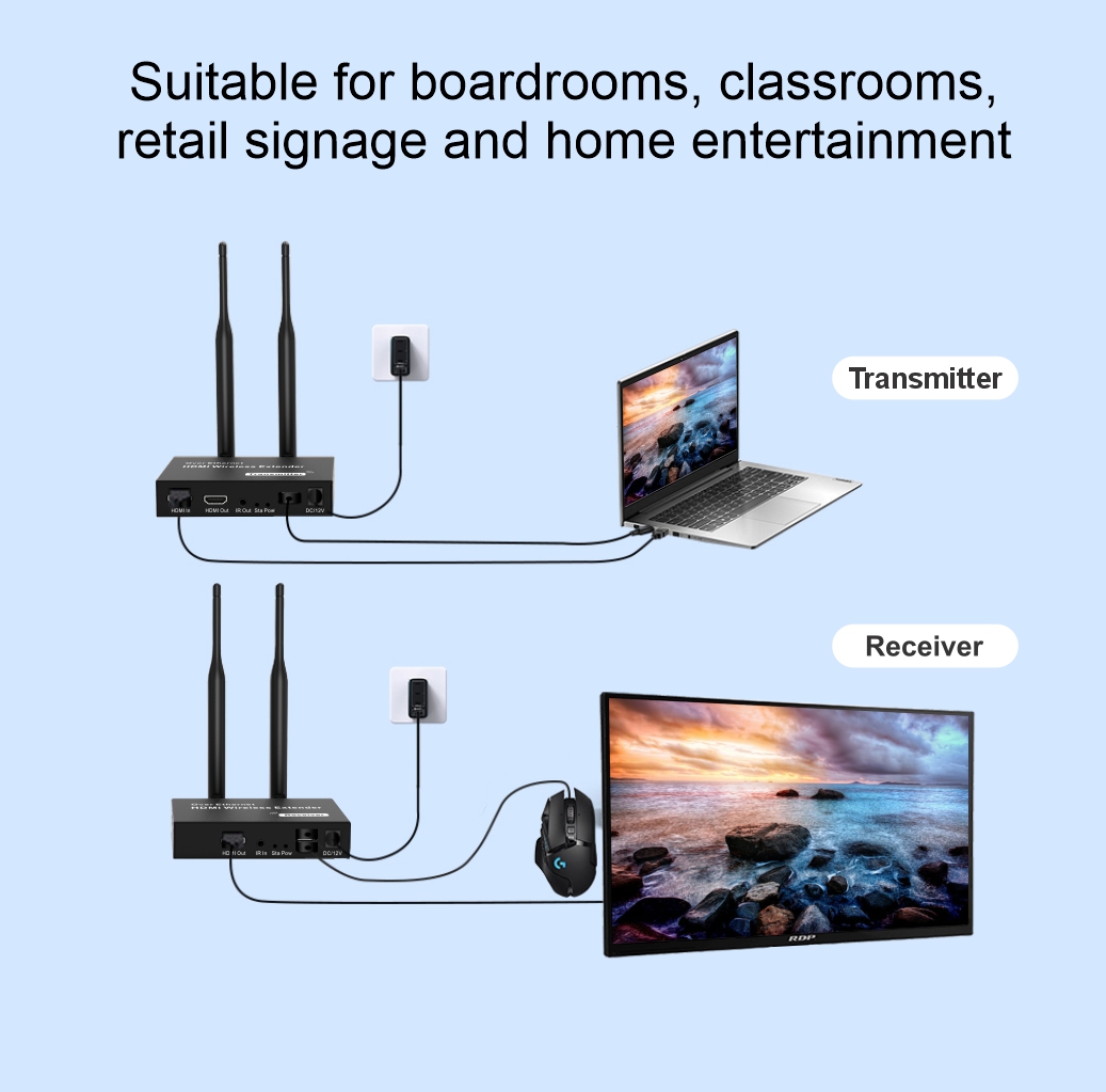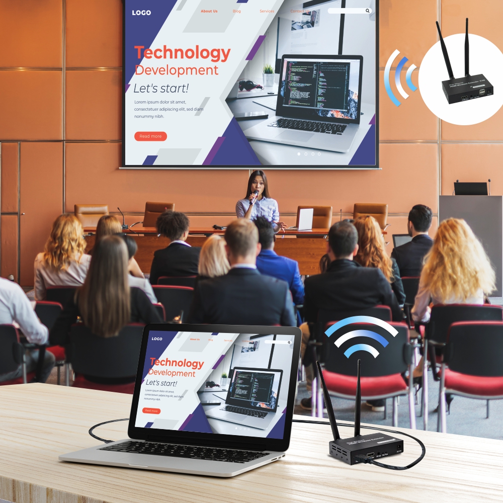 Ideal for classrooms, boardrooms, or digital signage setups where cabling is not feasible, this device supports transmission up to 200 meters in open spaces with low latency and strong signal integrity.