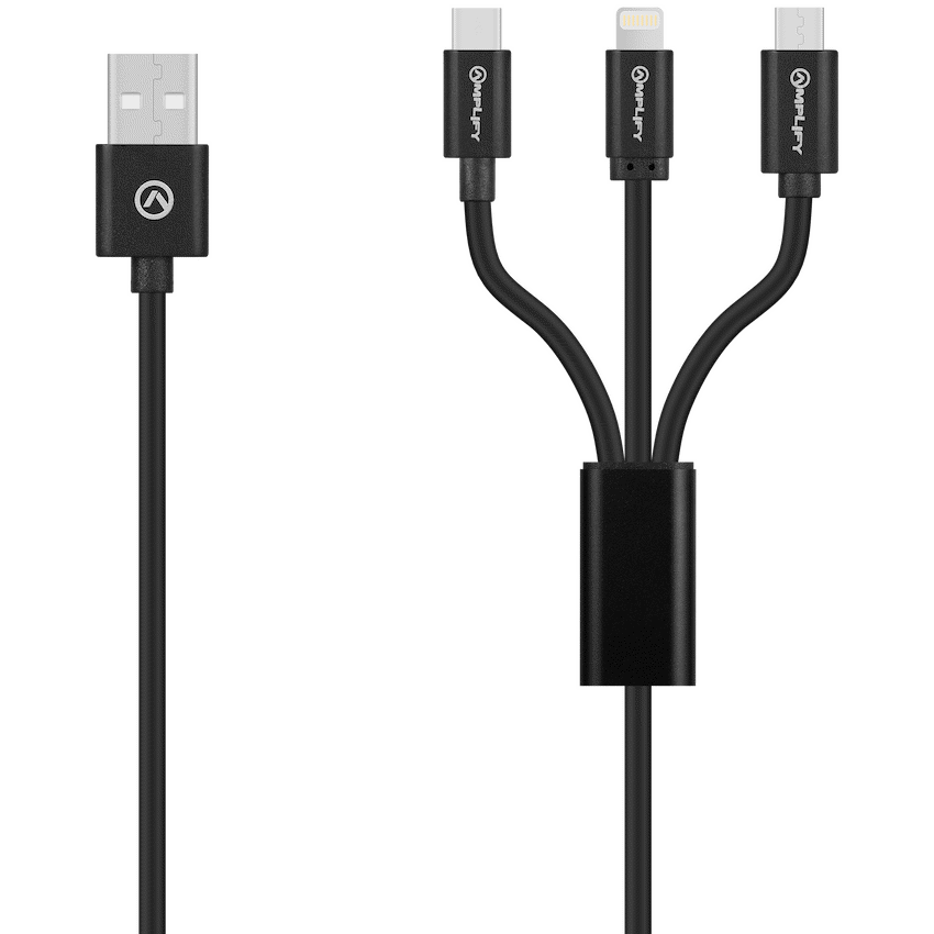 Charge all your devices with ease using the Amplify On The Fly 3-in-1 Charging Cable. Featuring Type-C, Lightning, and Micro USB connectors, this 1-meter cable combines convenience with a sleek gunmetal and black design-perfect for travel, work, or daily use. One stylish solution for all your charging needs.