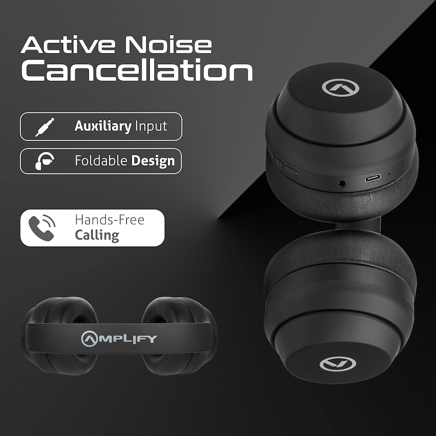 Experience peace and powerful sound with the Amplify Quietude Bluetooth ANC Headphones. Whether you’re commuting, working, or simply relaxing, these over-ear noise cancelling headphones help you stay focused by cutting out up to 20dB of ambient noise. Designed for comfort and versatility, they feature Bluetooth 5.3 for smooth wireless streaming and include a wired option for uninterrupted listening.Enjoy up to 20 hours of playtime, supported by a efficient USB-C charging, so you’re always ready to go. The 40mm drivers deliver rich, full-range sound, while the built-in microphone ensures clear hands-free calls on the move.If you’re looking for an affordable pair of wireless ANC headphones that don’t compromise on features, the Quietude Series has you covered-perfect for work, travel, or everyday audio enjoyment.Feature Highlights:Active Noise Cancelling – Reduces background noise by up to 20dB for focused listeningUp to 20 Hours Playtime – Long-lasting battery life for all-day audioWired & Wireless Flexibility – Use Bluetooth or switch to aux when neededOver-Ear Comfort – Cushioned ear cups for extended wear without fatigueBuilt-In Mic – Hands-free calling for work or personal useIPX3 Water Resistance – Light splash protection for daily useTechnical Specifications:Bluetooth Version: 5.3Chipset: BTBluetooth Range: 10mImpedance: 32?Frequency Range: 2.4GHz – 80GHzSensitivity: 108 +/-3dBNoise Reduction: 20dBBattery: 400mAhCharging Time: 2 HoursCharging Input: 1A (USB-C)Playtime: Up to 20 HoursDriver Size: 40mmWater Resistance: IPX3What’s in the Box:Amplify Quietude Bluetooth Headphones with Active Noise CancellingUSB-C Charging CableAux CableInstruction ManualBlock out the world and tune into what matters-quiet comfort meets high-performance sound.