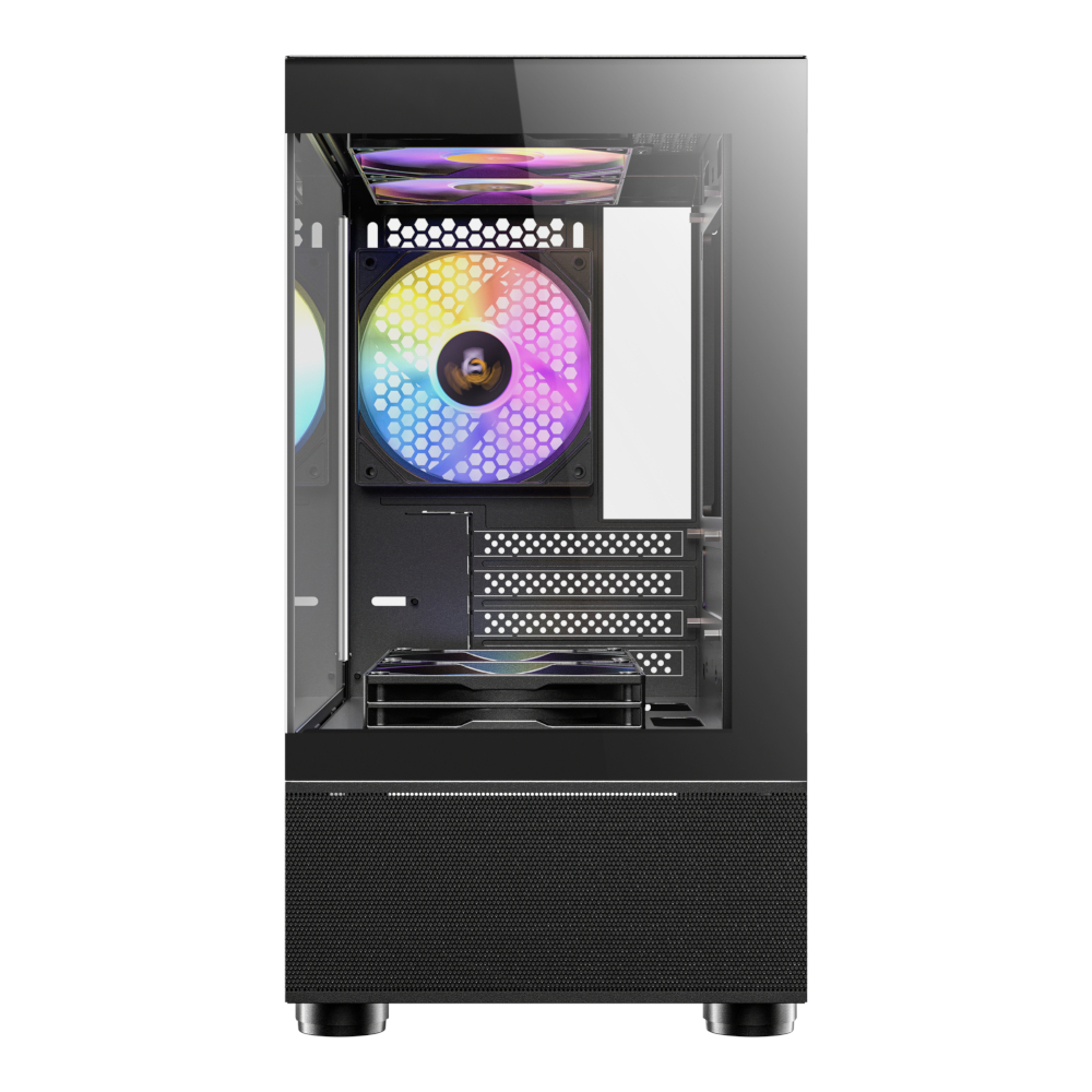 The Antec CX200M Elite Micro-ATX RGB Gaming Chassis is a compact powerhouse designed for gamers who demand both performance and aesthetics. This Mini Tower chassis ensures great airflow and ventilation with its vertical cooling system, which is enhanced by 2 x 120mm RGB top fans, 2 x 120mm RGB reverse fans, and a 120mm RGB rear fan. The panoramic 270° design, combined with tempered glass side and front panels, provides a stunning showcase for your components, making your gaming setup truly stand out. The top and bottom magnetic dust filters ensure your system stays clean and efficient, maintaining optimal performance over time.