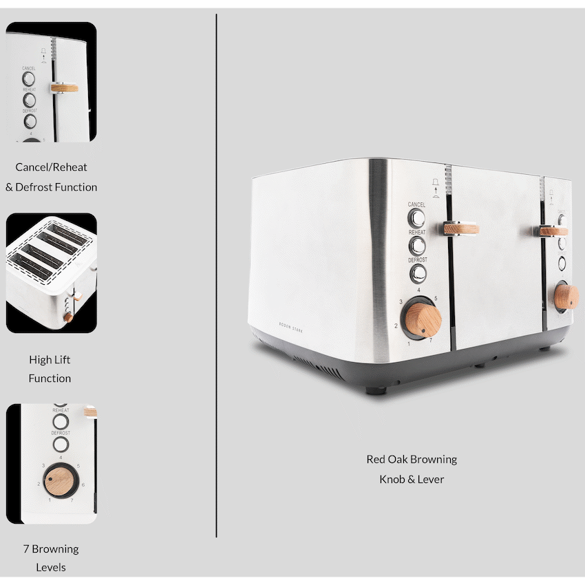 The Boden Stark Anson Collection Toaster blends natural elegance with everyday functionality. Featuring genuine red oak knobs, sleek stainless steel housing, and 7 browning levels, it offers the perfect balance of beauty and control – for toast done exactly your way.780-925W Power | 220-240V | 50-60HzDurable Stainless Steel Housing7-Level Browning Control for perfect results every timeGenuine Red Oak Knobs for a warm, crafted touch