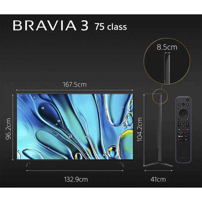 Transform your home entertainment with the Sony BRAVIA 3 75″ Class LCD TV, designed to deliver stunning picture quality, immersive sound, and a smooth, intuitive smart TV experience. Whether you’re watching blockbuster movies, cheering on your favourite sports team, or streaming the latest series, this 75-inch display brings every moment to life with exceptional clarity and vibrant colour. Powered by Sony’s advanced picture processing technology, the BRAVIA 3 enhances contrast, sharpens details, and keeps motion smooth-so fast-action scenes remain crisp and blur-free. The large 75″ screen and high-definition panel create a cinematic viewing experience ideal for living rooms and entertainment spaces. With Google TV built in, finding content is effortless. Browse across all your apps, discover personalised recommendations, and control your TV with your voice using Google Assistant. The BRAVIA 3 also features built-in Chromecast and Apple AirPlay, making it simple to stream content from your smartphone or tablet. Designed with Sony’s minimalist, sleek aesthetic, the slim bezel blends seamlessly into any home decor, keeping your focus on what matters-your content. Plus, energy-saving features help reduce power consumption without compromising performance.