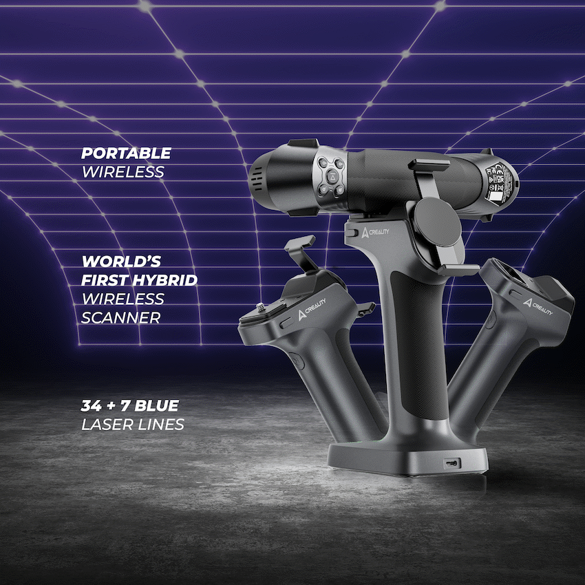 The Creality Raptor X Wireless 3D Scanner is the world’s first hybrid blue laser and NIR scanner, setting a new standard for professional 3D scanning. Designed for ultimate flexibility, it captures both intricate details and large-scale objects with metrology-grade precision.Equipped with 34 cross + 7 parallel blue laser lines, plus NIR structured light, the Raptor X scans objects from 5 mm up to 4000 mm with accuracy as fine as 0.02 mm. This makes it equally effective for jewellery, automotive parts, full-body scans, or large-scale design projects.Truly portable and wireless, the Raptor X connects via Wi-Fi 6 for lightning-fast, low-latency data transfer-delivering smooth, real-time scanning without cables holding you back. Lightweight and handheld, it’s built for fieldwork, studios, or industrial use, wherever high-speed precision is needed.Whether for reverse engineering, digital archiving, product design, or quality inspection, the Raptor X brings professional-grade 3D scanning into a compact, powerful, and cable-free workflow.