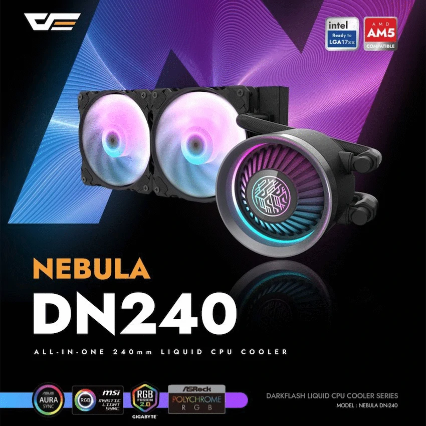 Keep your system running cool and looking great with the darkFlash DN240 liquid CPU cooler, a 240mm RGB AIO cooler perfect for high-performance gaming and creator setups. Equipped with a durable aluminium radiator and dual 120mm ARGB fans, it delivers both efficient heat dissipation and customisable lighting to elevate your rig’s look.Designed with a powerful 3-stage motor pump and high-temperature resistant tubing, the DN240 ensures stable and quiet operation even under heavy workloads. Thanks to its all-in-one cable design, setup is clean and clutter-free, making it a popular choice for South African PC builders seeking both form and function.Compatible with a wide range of Intel and AMD sockets, this cooler offers plug-and-play ease, making it an ideal upgrade or first-time install.