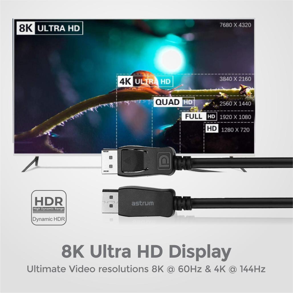 Supporting 8K @ 60hz UHD resolutions, this best Display port male-to-male cable also can be used for 5K (5120×2880)@60Hz, 4K (3840×2160) @60Hz/120Hz/144Hz, 2K (1080P/1440P) @120Hz/165Hz/240Hz.Backward compatible with DisplayPort 1.3/1.2/1.1