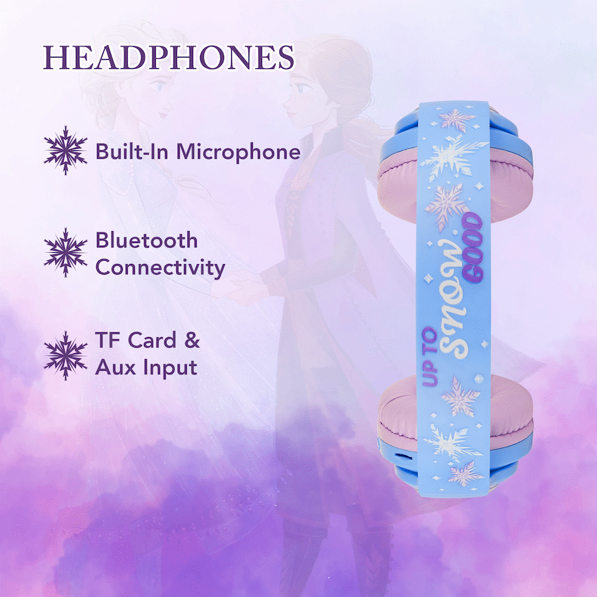 Treat your child to magical audio adventures with the Disney Frozen 3D Kids Bluetooth Headphones. Designed with comfort, safety, and fun in mind, these foldable wireless headphones feature a 3D Olaf design that fans will adore-plus a built-in volume limiter to protect young ears.Thanks to Bluetooth 5.3 and a long-lasting 800mAh battery, your child can enjoy up to 30 hours of wireless listening with the LED lights off, or 10 hours with them on. The headphones are padded and foldable for travel-friendly use, and include multiple playback options including Bluetooth and AUX.Ideal for school, road trips, or screen time at home, these headphones combine Disney magic with parent-approved features, making them the perfect audio companion for kids.Feature Highlights:Kid-Safe Volume Limit – Capped at 85dB to protect young earsUp To 30 Hours Playtime – Extended battery life keeps the music goingBuilt-In Mic For Calls – Stay connected with clear voice supportMultiple Playback Options – Use via Bluetooth or AUX for versatile listeningFoldable With Padded Comfort – Easy to store and comfy for little headsTechnical Specifications:Bluetooth Version: 5.3Chipset: BluetrumBluetooth Distance: 10mDriver Size: 40mmFrequency Range: 20Hz – 20kHzSensitivity: 85dBImpedance: 32?Battery: 800mAhCharging Time: 2-3 HoursStandby Time: 48 HoursCharging Port Type: USB-CPlayback (LED Off): Up to 30 HoursPlayback (LED On): Up to 10 HoursWhat’s in the Box:Disney Frozen 3D Bluetooth HeadphonesUSB-C Charging CableInstruction ManualAdd a touch of Disney to your child’s day with headphones that are safe, comfy, and built to entertain.