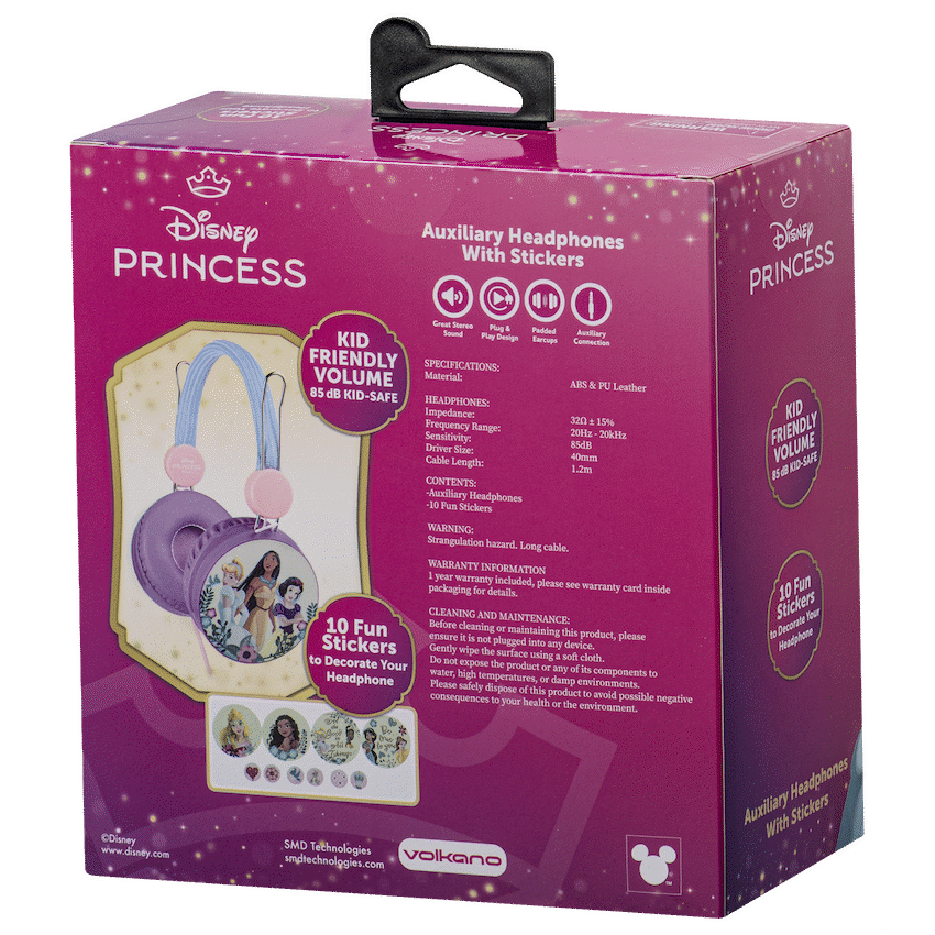 Treat your little royal to magical moments with the Disney Princess Padded Kids Headphones. Designed for comfort, safety, and fun, these beautifully themed kids headphones feature soft padded earcups and an adjustable fit for all-day listening. Plus, the included 10 Disney Princess stickers let kids decorate their headphones with their favourite characters-from Belle and Cinderella to Ariel and more.Volume-limited to 85dB, these safe volume headphones help protect growing ears while still offering rich stereo sound. With a plug-and-play AUX connection, they’re compatible with most tablets, laptops, and learning devices. Whether it’s for entertainment or education, these headphones are a charming choice for everyday use.Feature Highlights* Kid-Safe Listening (85dB) – Keeps audio levels safe for children* Includes 10 Princess Stickers – Personalise headphones with favourite characters* Cushioned Earcups – Soft, snug fit for lasting comfort* Quality Stereo Sound – 40mm drivers deliver crisp, clear audio* Plug & Play AUX – Quick and easy connection to most devicesTechnical Specifications* Material: ABS & PU Leather* Impedance: 32 ? +/- 15%* Frequency Range: 20Hz-20kHz* Sensitivity: 85dB* Driver Size: 40mm* Cable Length: 1.2mWhat’s in the Box* Disney Princess Padded Auxiliary Headphones* Disney Princess 10 Fun StickersMake every listening moment magical with these safe and customisable Disney Princess headphones-fit for every young dreamer.