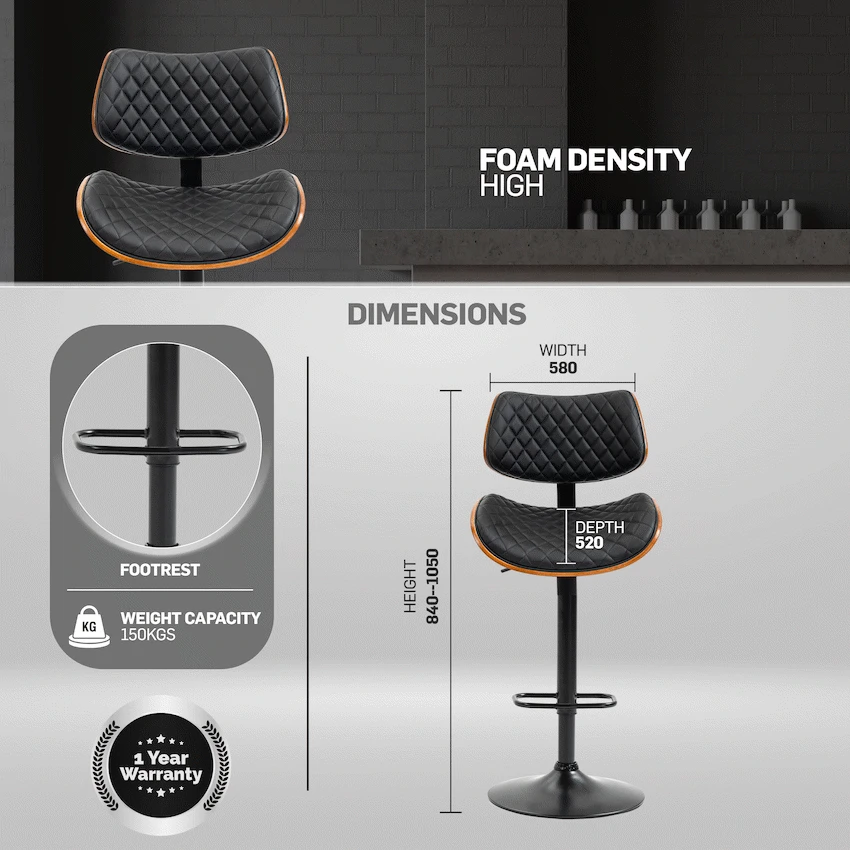 Everfurn Ava Barstool, PU, Bent Wood, Powder Coated Steel Base, Height Adjustable