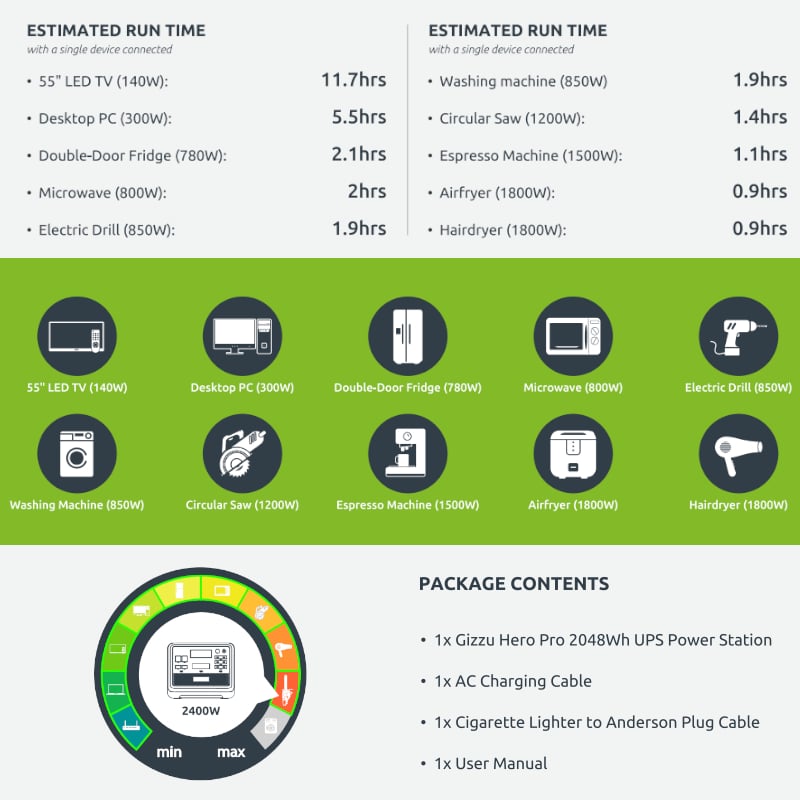 Deliver power wherever and whenever you need it with the portable Gizzu Hero Pro UPS Power Station. The Hero Pro offers 2048Wh of battery capacity. It’s great for keeping your devices charged during outdoor adventures and powering most household appliances during loadshedding. The elegant design is durable, robust, and can be taken with you on any adventure.