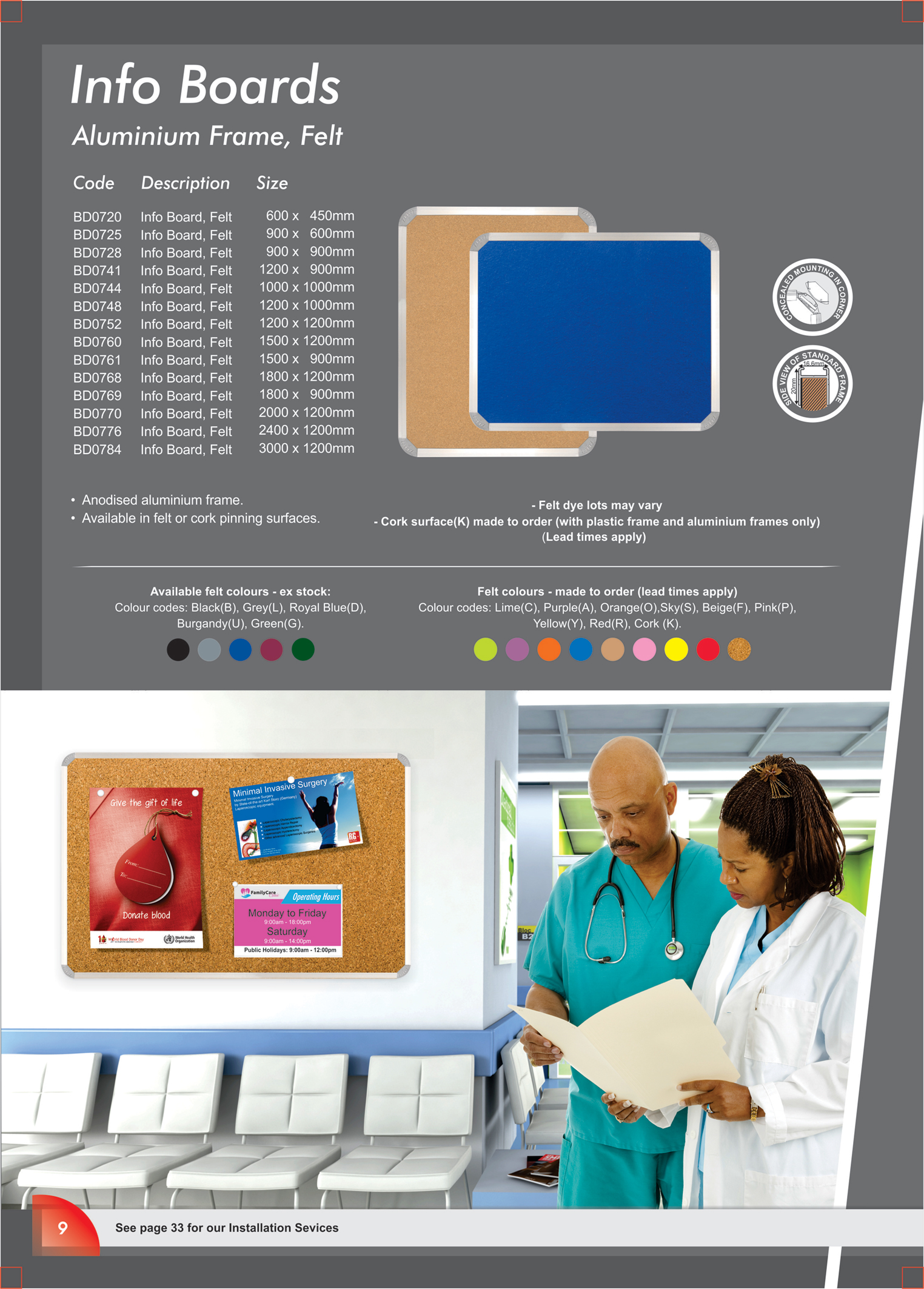 • Available in felt or cork pinning surfaces