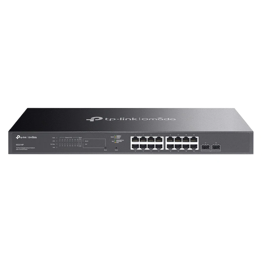 The TL-SG2218P combines intelligent switching capabilities with Power over Ethernet (PoE) support, making it ideal for powering devices like IP cameras, wireless access points, and VoIP phones. It features 16x 10/100/1000 Mbps PoE+ RJ45 ports and 2x Gigabit SFP slots, delivering a total PoE power budget of 150 W, compliant with 802.3at/af standards. This ensures seamless connectivity and power delivery across a wide range of networked devices.Integrated with TP-Link’s Omada SDN platform, the switch supports Zero-Touch Provisioning (ZTP), centralized cloud management, and intelligent monitoring via the Omada app or web interface. This allows IT administrators to manage multiple devices and locations from a single dashboard, simplifying network operations and reducing overhead.Advanced Layer 2 and Layer 3 features include static routing, 802.1Q VLAN, Link Aggregation, IGMP snooping, and L2/L3/L4 QoS, optimizing traffic flow and ensuring reliable performance for voice, video, and data applications. The switch also supports IPv6 with dual-stack architecture, MLD snooping, and other next-gen networking protocols.Security is a core strength of the TL-SG2218P, offering IP-MAC-Port Binding, Access Control Lists (ACLs), 802.1X authentication, RADIUS, DHCP snooping, DoS defence, storm control, and port security. These features protect against unauthorized access, spoofing, and network attacks, ensuring a safe and stable environment.