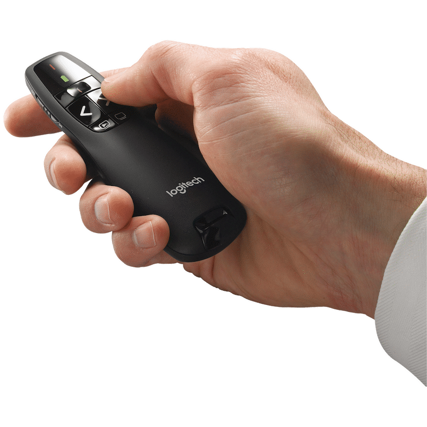 Make your point. With a curved design, intuitively placed controls, and a bright red laser you’ll be in control from start to finish. Feel free to move around the room, up to 50 feet (15 meters).Conveniently easy to use:- Intuitive slideshow controls: Navigate through your presentation with confidence. Buttons are easy to find by touch. And the gentle contours feel great in your hand.- Plug-and-play simplicity: Its easy to get started, with no software to install. Just plug the receiver into a USB port to begin.- Storable receiver: When the show is over, just store the receiver in the presenter, tuck the presenter into the carrying case, and youre off.Power to deliver effective presentations:- Red laser pointer: Make it easy for your audience to see exactly what youre pointing to.- Up to 50-foot (15-meter) range: Move around. Work the room. Meet your audience. With a long range, you can mingle with the crowd for greater impact and engagement.What’s in the box1 x Wireless Presenter