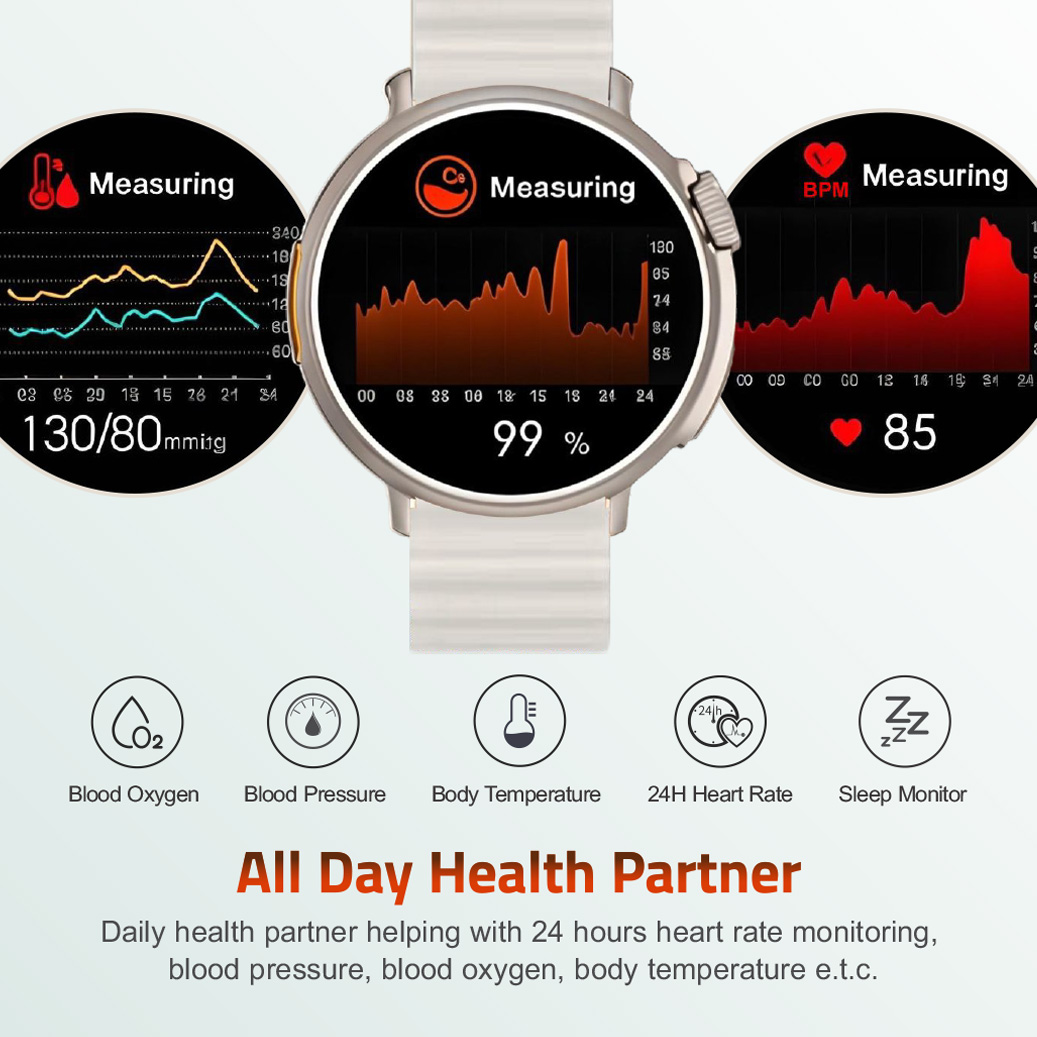 Monitor your health with real-time blood oxygen tracking, blood pressure measurement, and body temperature monitoring. The 24-hour heart rate monitor aids in optimizing your training sessions and overall well-being.