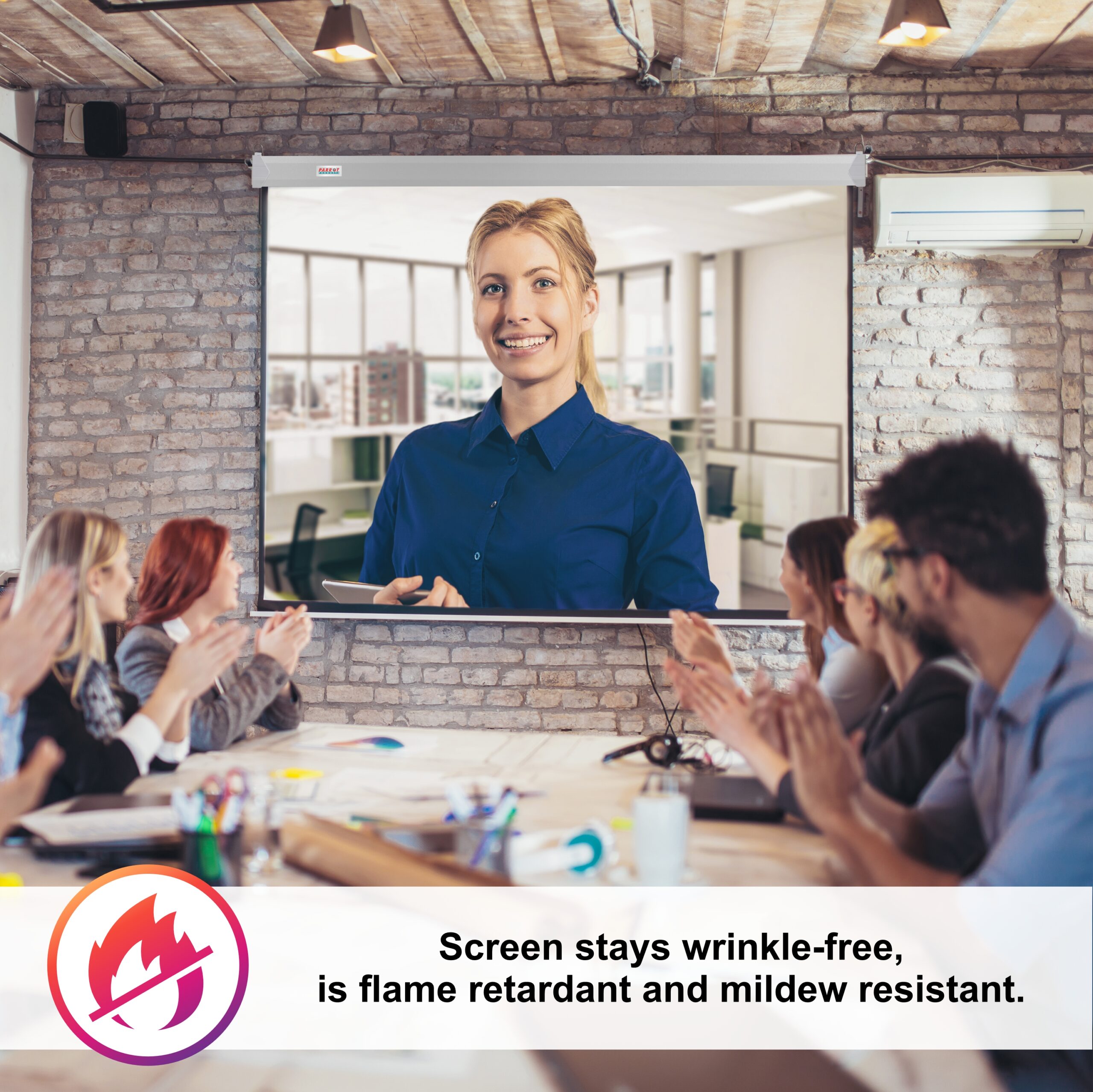 - Screen stays wrinkle-free, is flame retardant and mildew resistant.