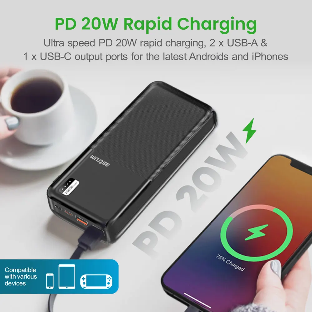 The core feature of this power bank is its fast charging capability. It supports PD20W (Power Delivery) through its USB-C port, allowing compatible devices such as smartphones, tablets, and even some laptops to charge rapidly. The PD technology intelligently adjusts the power output based on the connected device’s requirements, delivering faster charging times compared to standard USB ports.