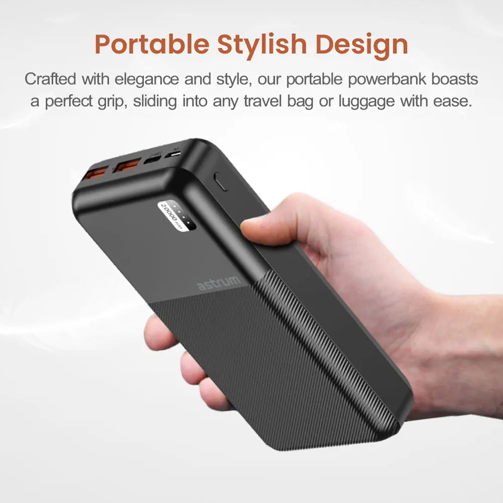 Introducing our fast charging portable power bank, equipped with advanced features to keep your devices powered up wherever you go. This power bank is designed with PD20W USB-C and dual USB-A ports, multi-input capabilities, and inbuilt smart IC technology, ensuring efficient charging and versatility for a wide range of devices.