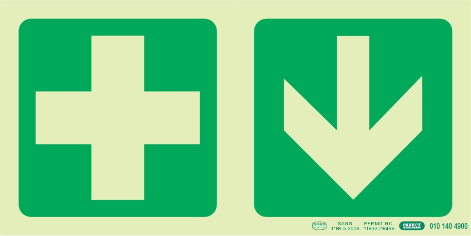 Photoluminescent 190MM Safety Sign – E7A-Green Cross+Arrow Down R104.08