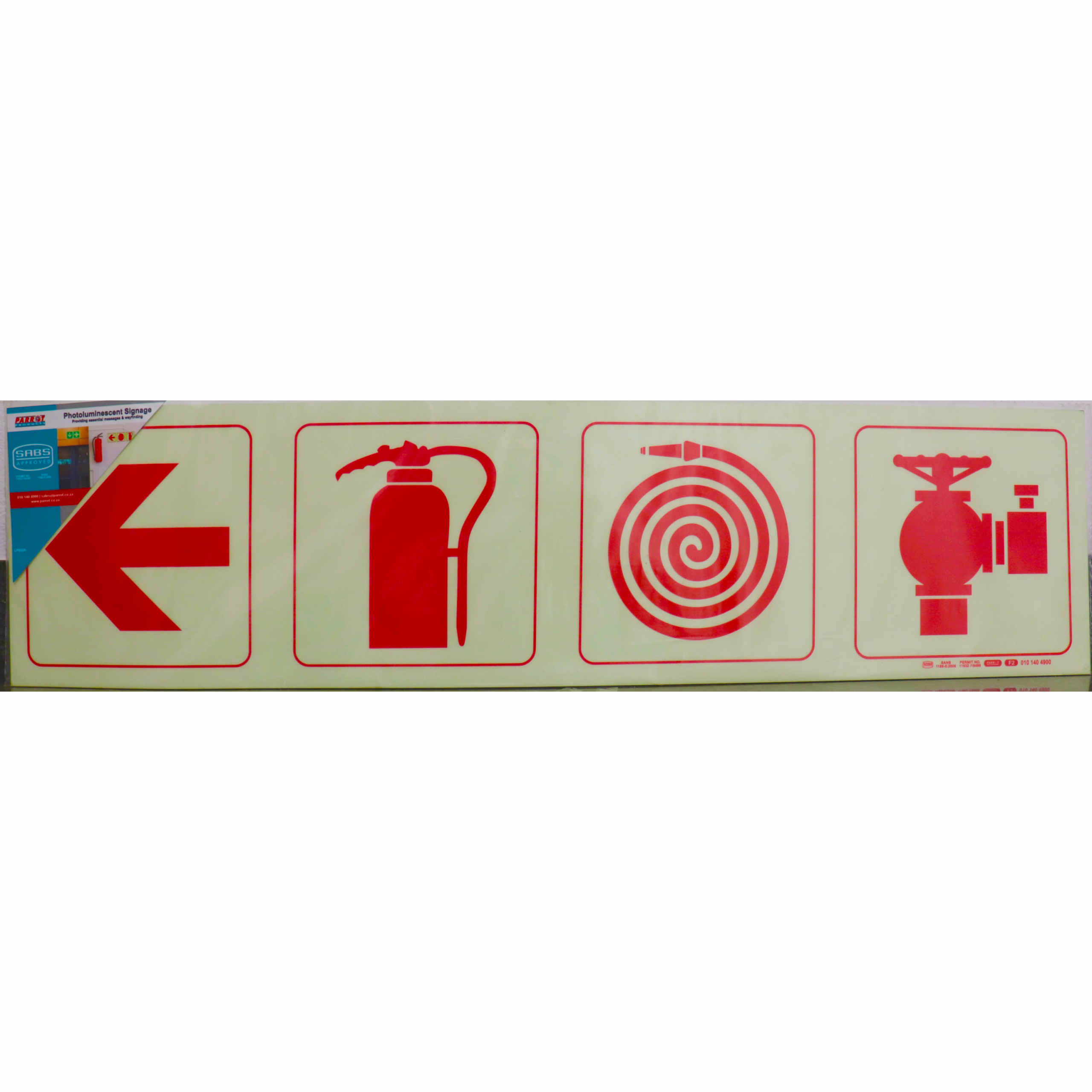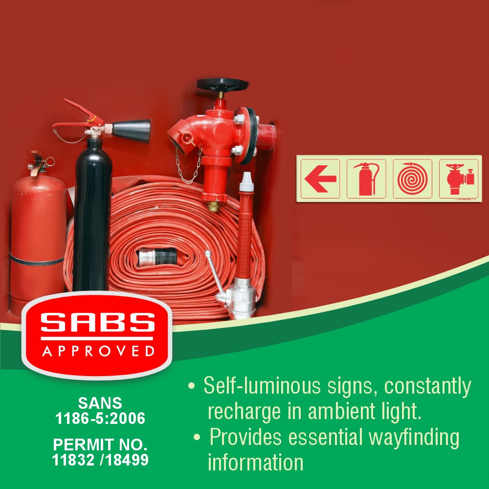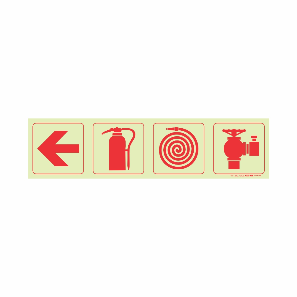 Photoluminescent 190mm Safety Sign – F1-Arrow Down + Fire Extinguisher + Fire Hose Reel+Fire Hyrant