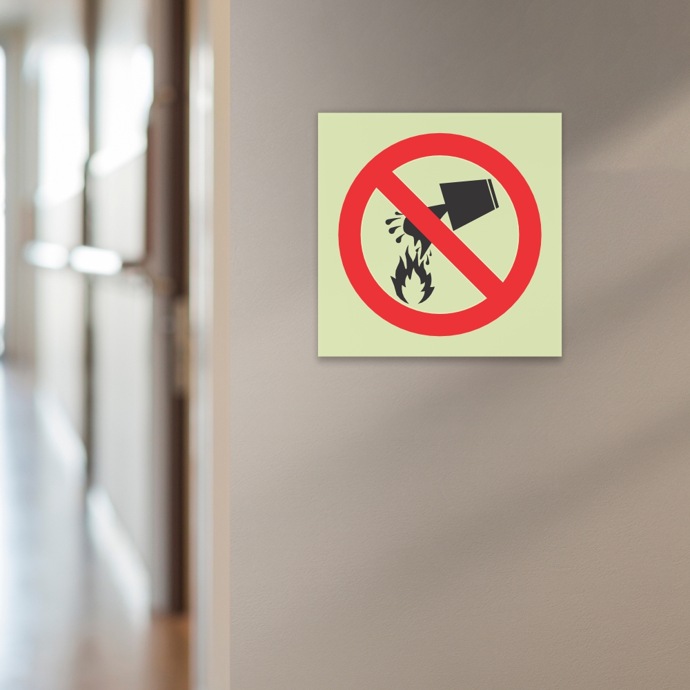 PHOTOLUMINESCENT 190MM SAFETY SIGN – F25-WATER PROHIBITED AS EXTINGUISHING AGENT