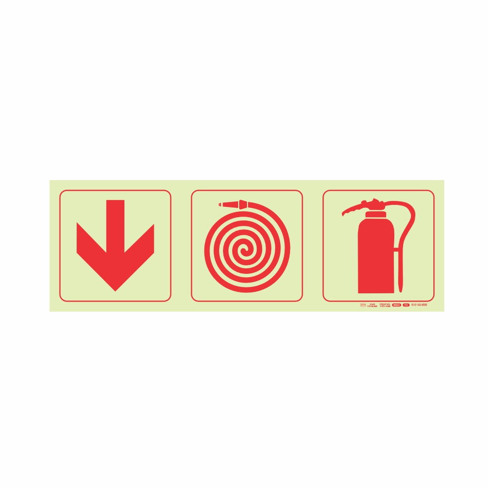 PHOTOLUMINESCENT 190MM SAFETY SIGN – F4-ARROW DOWN+FIRE HOSE REEL+FIRE EXTINGUISHER