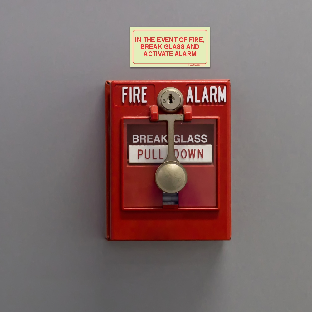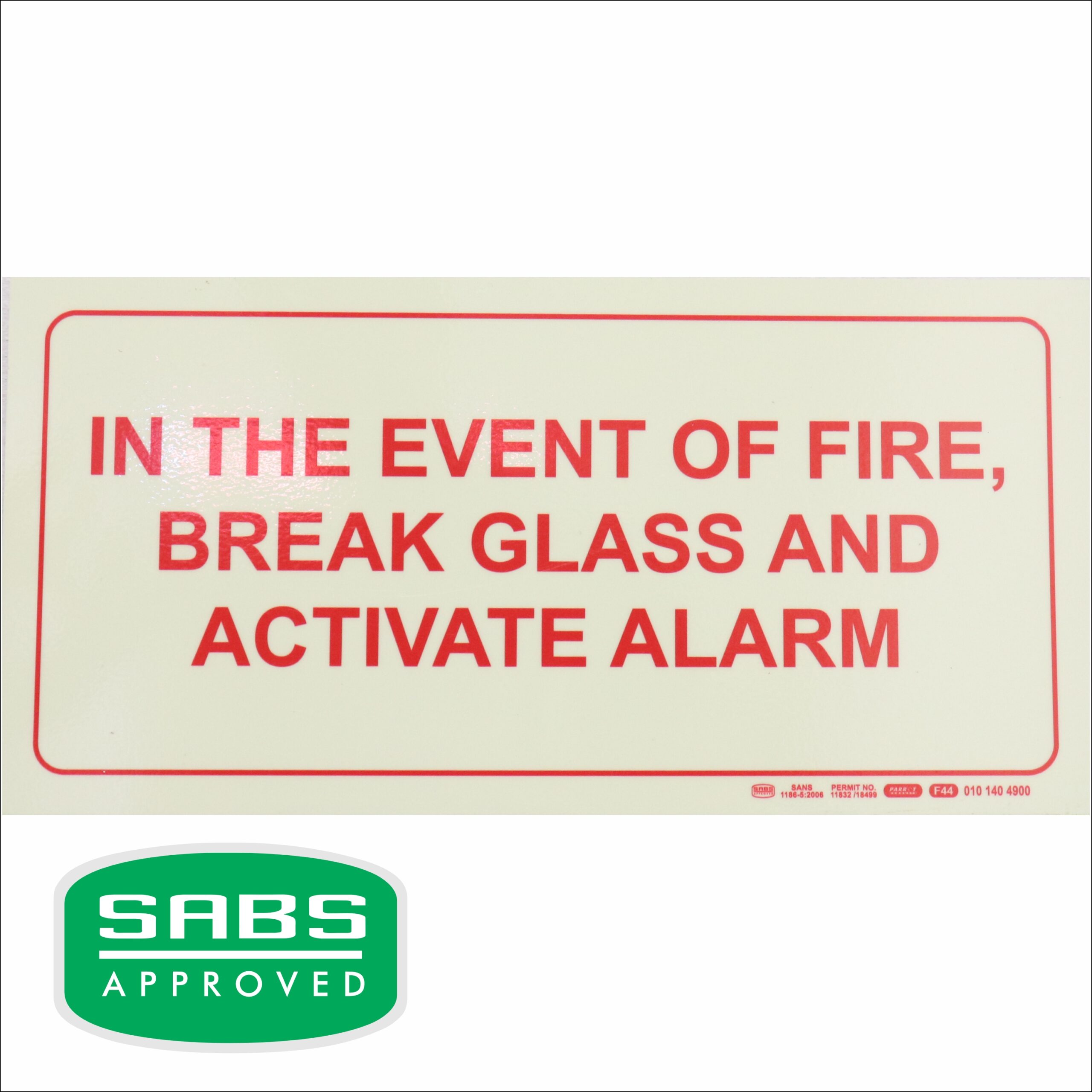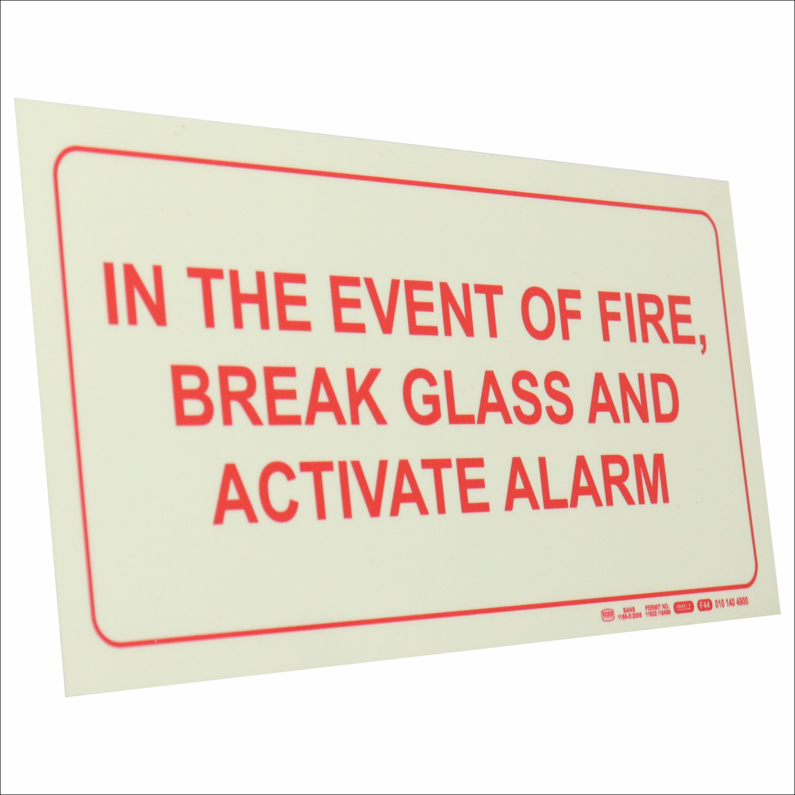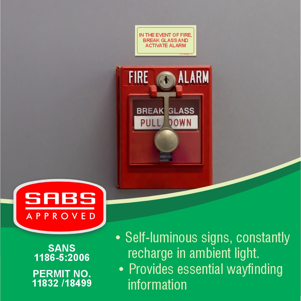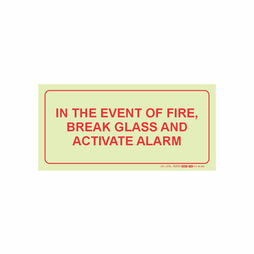 PHOTOLUMINESCENT 190MM SAFETY SIGN – F44-IN THE EVENT OF A FIRE, BREAK GLASS AND ACTIVATE ALARM