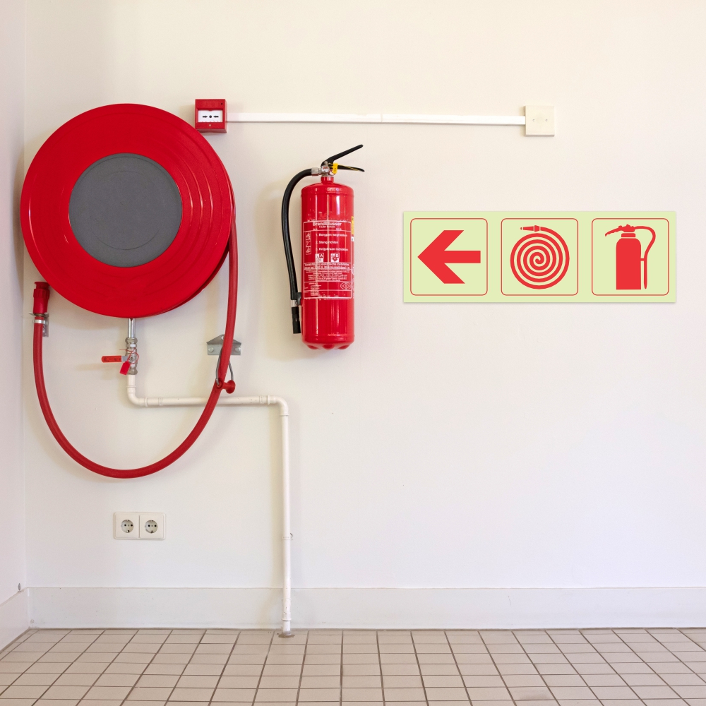 Photoluminescent 190mm Safety Sign F5 Arrow Left Fire Hose Reel Fire Extinguisher