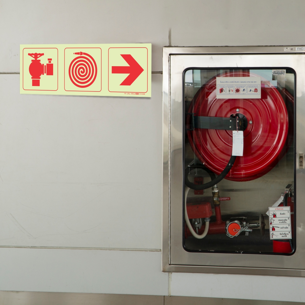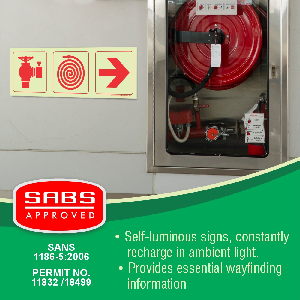 PHOTOLUMINESCENT 190MM SAFETY SIGN – F9-FIRE HYDRANT+FIRE HOSE REEL+ARROW RIGHT