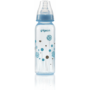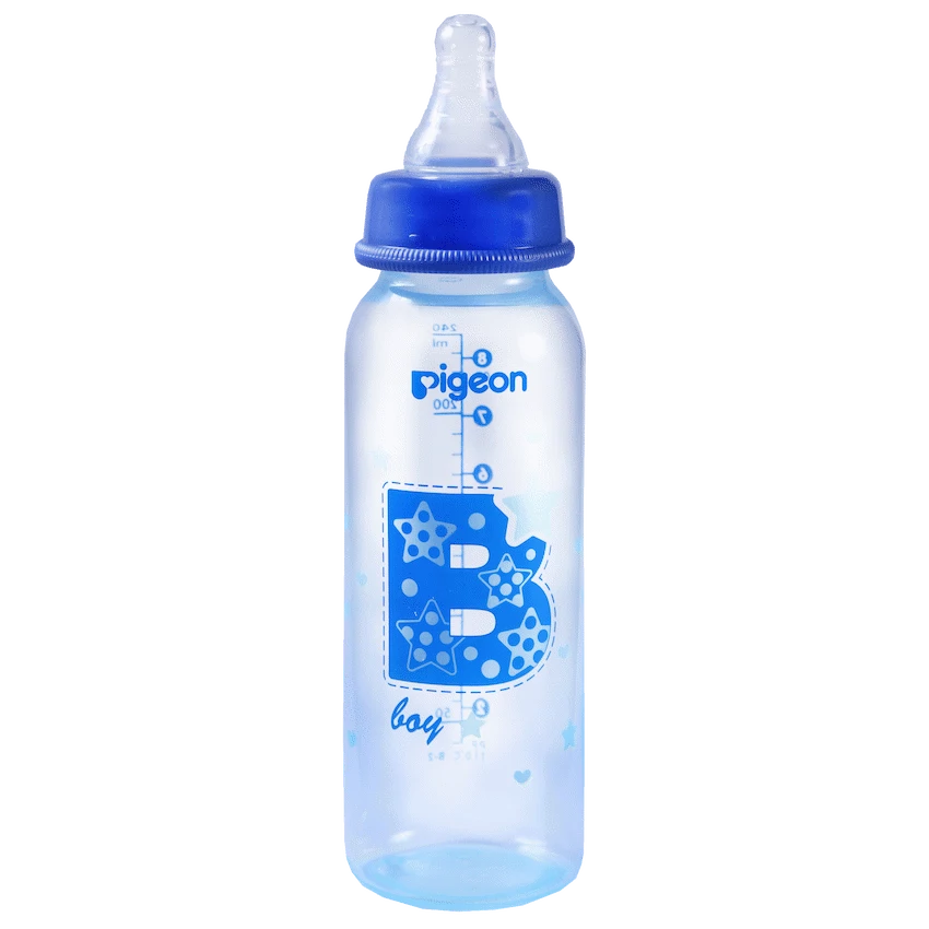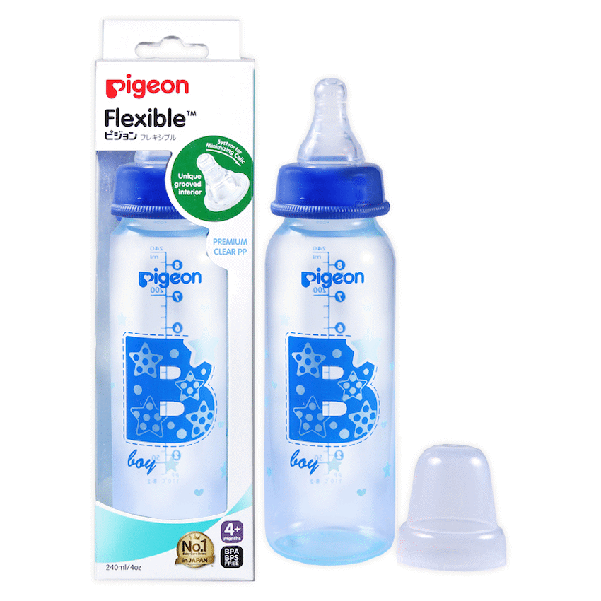 The Pigeon FlexibleTM PP Bottle is a 240ml is for a 3+ months baby slim neck bottle with a cute blue balloon design. Use with FlexibleTM Peristaltic Teats is made from light weight plastic. Best suited for low to regular use. When baby is not breast-fed. Baby is very small and if baby sometimes fusses at the teat. Comes with a Flexible Medium (M) hole Nipple which has a slim neck and is made with double thick silicone that is soft and makes latching easy. Along with a venting system that helps minimize swallowed air and colic in babies. This bottle is BPA free.