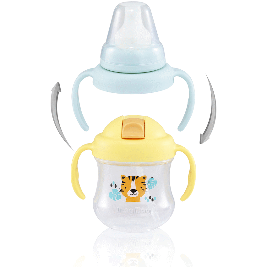 The Pigeon MagMag Step-Up Set is designed to promote and develop your baby’s drinking habits through the offering of interchangeable drinking tops.The Spout top has a spout that is soft and gentle on the gums, and features a spill proof cross-cut opening. The handles are angled for ease of drinking when tilted and the spout is interchangeable with Pigeon SofTouchTM Peristaltic PLUS Teats. The Straw top has a soft silicone straw uniquely angled for drinking to the last drop, and a cross cut opening to reduce the risk of spills. The lid is leak proof and there are wide handles for easy grip. Cute lion motif on the cup. BPA and BPS Free.