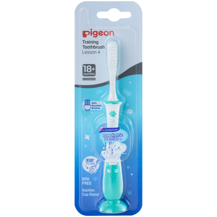 Pigeon’s Training Toothbrush Lesson 4 is designed to introduce your baby to their first real toothbrush. Co-developed with a leading Paediatric Dentist. The soft, rounded bristle ends clean and remove plaque and food particles. The curved handle allows natural grip and better control.Suitable for children above 18 months, or 12 – 20 milk teeth.