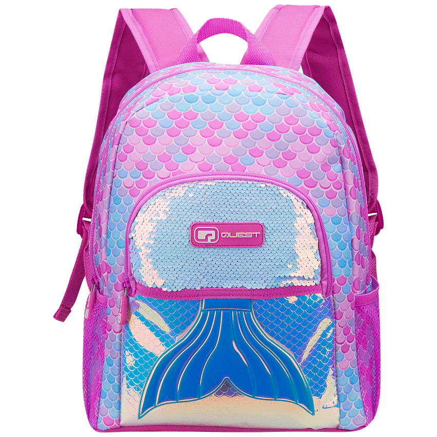 Quest Mermaid Shimmer Pre-School Backpack has a main zippered compartment as well as a front zippered pocket to allow for easy access to smaller items. It has unique features like sequin front & debossed PVC. It is a great choice for preschool because of its size and lightweight benefits.