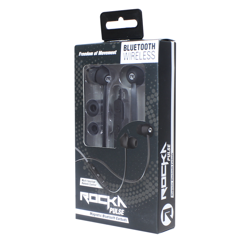Rocka Bluetooth Earphones – Pulse Series(Black)Bluetooth Version: 5.0Bluetooth Range: 10 mCharging Time: 2 HoursPlaytime: 3 – 4 HoursWhat’s in the box- Rocka Pulse 2.0 Series Bluetooth Earphones- USB Charging Cable- Instruction Manual- Carry Case- 3 x Earbud Cap Sizes- Cable Length Adjuster Clip