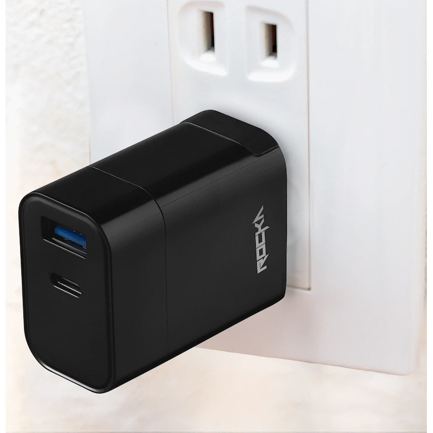 Fast Cars, Fast internet and now Fast charging, the Rocka Rapid Series has got you covered and is ready to keep your phone alive and awake from the moment you wake up.2 charging ports to accommodate for old school USB type cables and for the all new Type C points, this will help everyone keep their phone Rapid charging, the other benefit is charging 2 phones at the same time on this wall charger.SpecificationsInput: AC 100~240V @ 0.35A- Output: Maximum 18Watt- Output 1: USB Type-A Q.C. 3.0 ; 5V @3A, 9V @ 2A, 12V @ 1.5A- Output 2: USB Type-C: 5V @ 3A, 9V @ 2A, 12V @ 1.5A- Size: 55 x 45 x 28 mm- Weight: 68gWhat’s in the box1 x Rapid Series QC3.0 + PD Wall Charger 18W