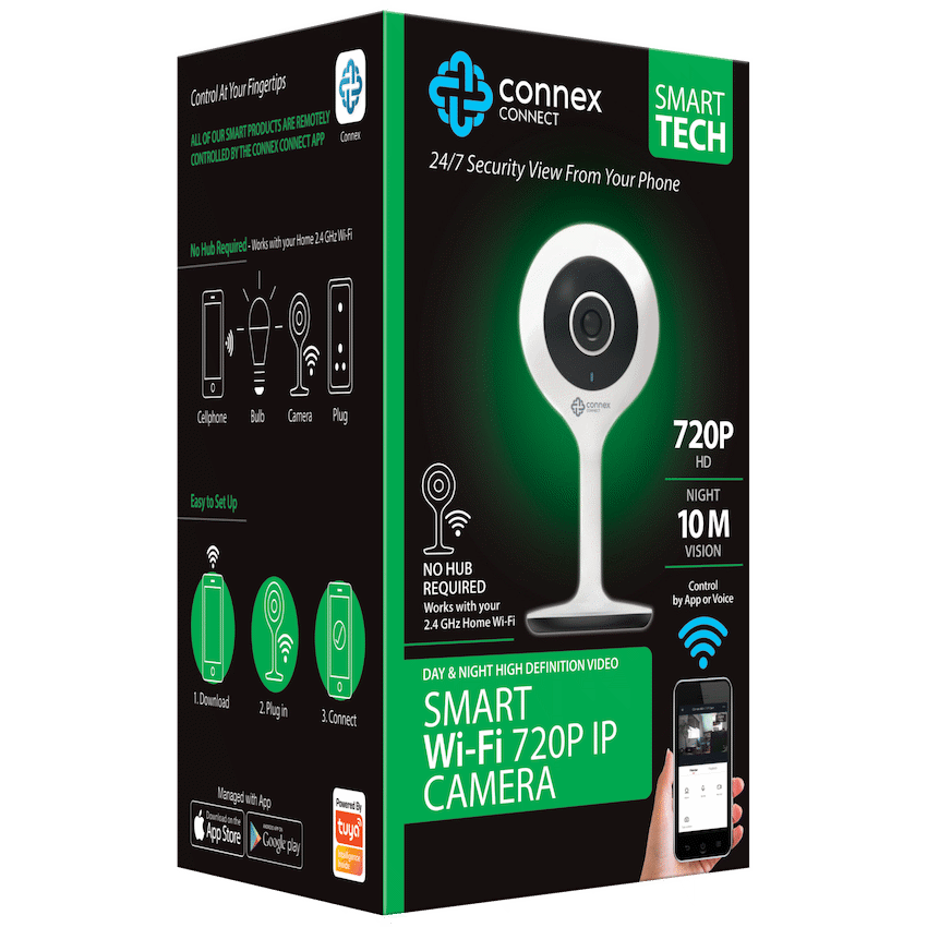 Real Time Monitoring Enjoy peace of mind knowing you can get a live video feed of inside or outside your home. Automate your smart home with intelligent alerts.Video Playback : Log in to your camera any time to get a live view of activity at your home on your smart phone. 2-Way Audio : Intercom-style audio means you can hear what is going on and talk through the camera. Camera Sharing : Share camera access with family or colleagues, allowing multiple people to check in any time.720p-camera DAY / NIGHT VISION Get crystal clear HD video footage during the day and at night with enhanced night vision. The auto infrared LED switches on in low light levels ensuring your view is not obscured in the dark.Features:Camera Sharing Share camera views with trusted family members or share individual cameras with work colleagues for security and peace of mind.Home Automation Trigger other Connex Connect Smart Tech devices when your camera detects movement or audio. Turn on lights or sound an alarm to scare away intruders.Record All Activity The camera automatically saves a snapshot to the cloud whenever movement is detected. Insert an SD card a record up to 72 hours of footage to review later.Easy Installation Getting one or multiple cameras set up around your house is easy. All you need is a Wi-Fi connection and a power plug. Pair the camera to your home network and access it immediately from the Connex Connect app.All From One App The free Connex Connect app controls all of your Smart Tech devices with an easy to use interface and intelligent automation Features: including push notifications, configurable scenes and IFTTT integrations.What’s in the box1 x Camera