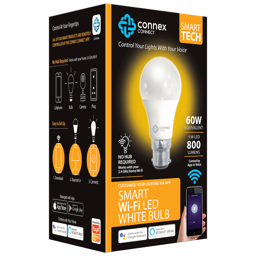 Efficient LED Smart lighting, saving 90% energy, sharply decrease your electricity costs. Bulb Type: Screw E27 Sharing: Share bulb access with family or colleagues, allowing multiple people to manage the smart lighting.Voice Control Go hands-free with Amazon Alexa and Google Assistant. Turn on/off lights via voice command. Especially convenient when your hands are full.Features::Sharing Lighting Share control of lights with trusted family members or share individual lights with work colleagues.Security Trigger Smart Tech lighting devices when your Motion, Door, Camera sensors detect movement or noise. Turn on lights, flashing red to scare away intruders.Grouping Group multiple Smart Tech lights to operate together or to manage via Voice assistant.Easy Installation Getting one or multiple lights set up around your house is easy. All you need is a Wi-Fi connection and a Smart Tech LED light bulb. Pair the Smart Light to your home network and access it immediately from the Connex Connect app.What’s in the box1 x LED Bulb