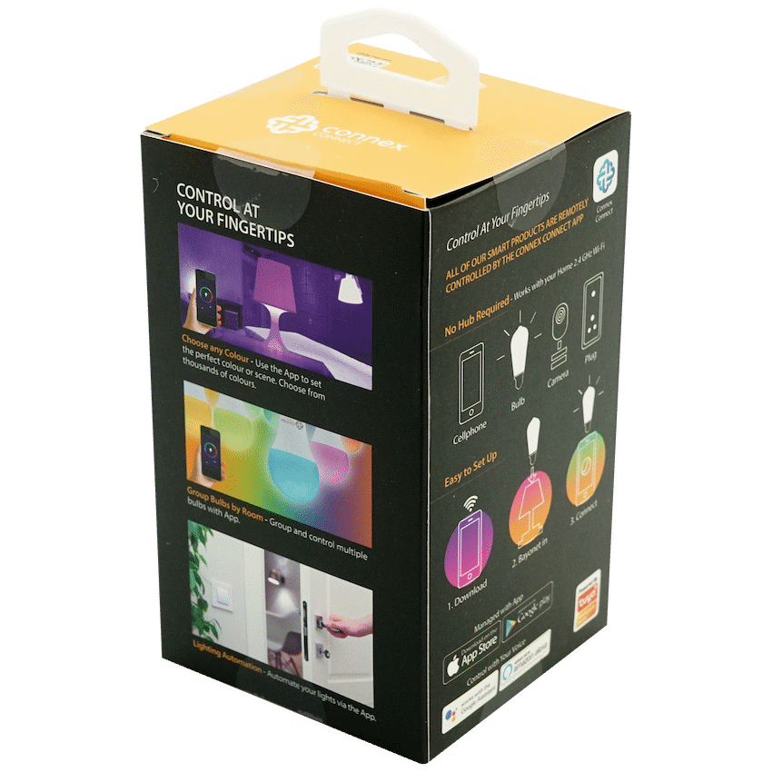 Make your Home more of a Smart Home with an aesthetically appealing, soft, vintage twist! Works with Amazon, Alexa and Google Assistant, the Connex Connect Smart 5W LED Amber Filament Screw Bulb is here to simplify your life and allow you to control your lighting even when you’re not home. Managed via WiFi or Bluetooth, this makes it amazingly convenient if you’re coming home late and you would rather not come home to darkness. Set timers, schedules and group your lighting. No need to have it at one level of brightness either, this stunning candle-shaped bulb is dimmable so you can adjust it to your needs and liking. Ever environmentally conscious, this bulb is a Class A Energy Efficient LED that provides 80% power savings compared with incandescent bulbs.Special Features:- 5W LED Bulb equivalent to 60W- Colour Temperature Adjust between Warm & Cool White- Manage your Lights with 2.4Ghz WiFi and Bluetooth on your Mobile via The Connex Connect APP- Support for Alexa & Google Voice Assistant- Dimmable White Filament Bulb- Set Timers, Schedules, Group and Share Lights- Easy DIY Installation and Connection- ICASA and NRCS Approved with Local In-App Support- Energy Efficient: Class A Energy Efficient LED with 80% Power Savings compared with Incandescent BulbsSpecifications: App: Connex Connect Bulb Shape: Squirrel Cage ST64 Voltage In: 220 / 240V Light: Colour Temperature Dimmable Now with BT Support Light Colour : Warm White 2,700K Average Lifetime: 25,000 Hours Connectivity: WiFi 802.11bgn 2.4GHz Light Colour Code: CCT 2,700K Bulb Finish: Amber or Clear 1 Year WarrantySystem Requirements: Mobile Device running iOS 8 or higher orAndroid 4.1x or higher Connex Connect App Existing 2.4GHz WiFi Existing Light Socket (E26)What’s in the box1 x LED Amber Filament Vintage Smart Bulb1 x Instruction Manual with Voice Assistant Guide.