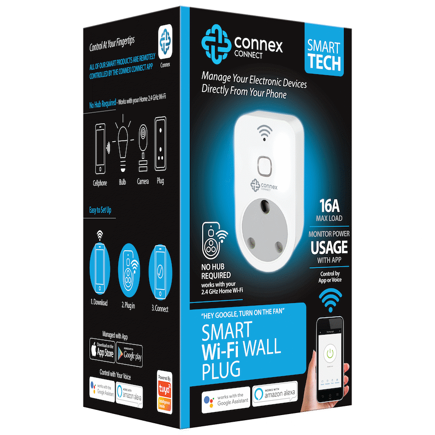 Smart WiFi Plug 3 Pin SA 16A Smart WiFi 3 Pin, SA 16A Plug, control from anywhere, includes Power Monitoring, Load shedding restart status, requires a 3 Pin SA Type M socket.No hub required, the plug connects to your 2.4 GHz home WiFi network, via your smartphone and the Connex Connect App, set Schedules and Automations via the App or have hands-free control with Google Voice Assistant or Amazon Alexa.Easy installation with quick App download from Google Play Store or Apple Store, securely pair the plug to your WiFi and remotely manage your plugs from anywhere in the world.