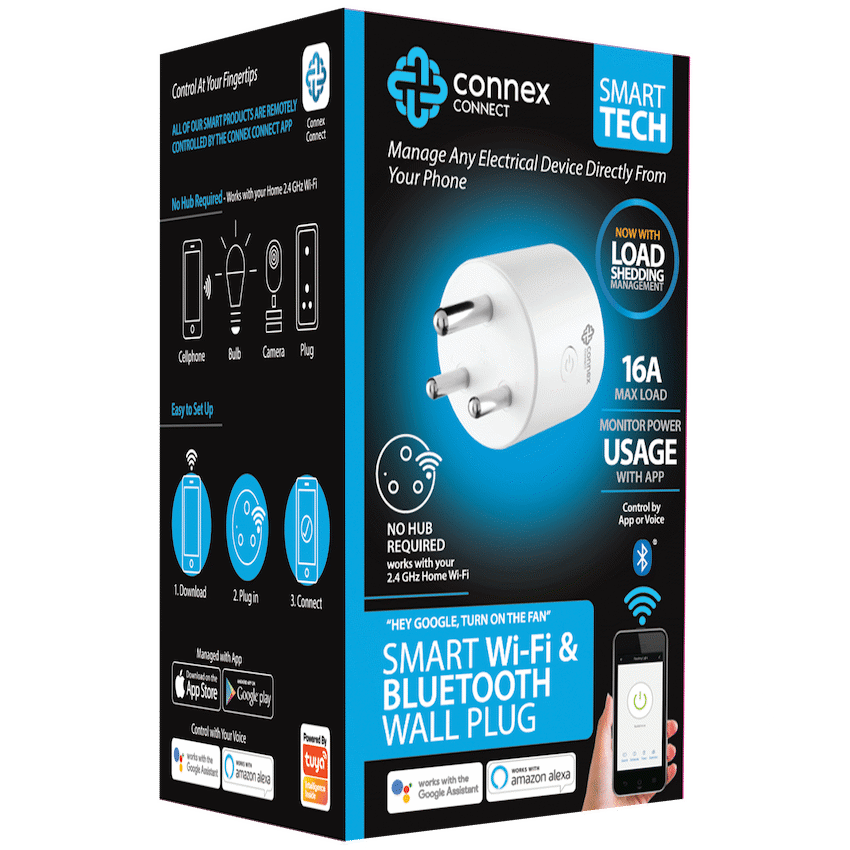 “Hey Google, Turn on the Fan”. This insanely cool little gadget is designed to streamline your home in a multitude of ways. Control it using voice control via WiFi or BT, use it to monitor power usage and as part of a much needed element for any Smart Home. Special Features:- Monitor Power Usage- Load shedding Restart- Control via WiFi or BT Specifications:- App: Connex Connect- Dimensions: D 61 mm * H 79 mm- Shape: 3-Pin South African Plug, Type M- Technology: LED & WiFi, BT- Connectivity: WiFi 802.11bgn 2.4GHz- Max. Load: 16 Amps- Voltage In: 220 / 240V- Plug Control: Turn On & Off with Timer- Materials: PVC, V0 Fireproof- 1 Year WarrantySystem, Requirements:- Mobile Device running iOS 8 or higher or Android 4.1x or higher- Connex Connect App- Existing 2.4GHz WiFiWhat’s in the box1x Smart WiFi and Bluetooth Plug – 3 Pin SA Round 16A 3360W