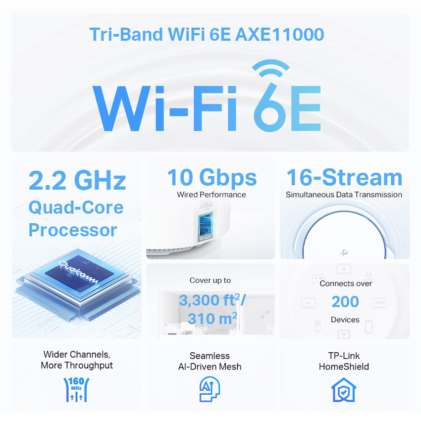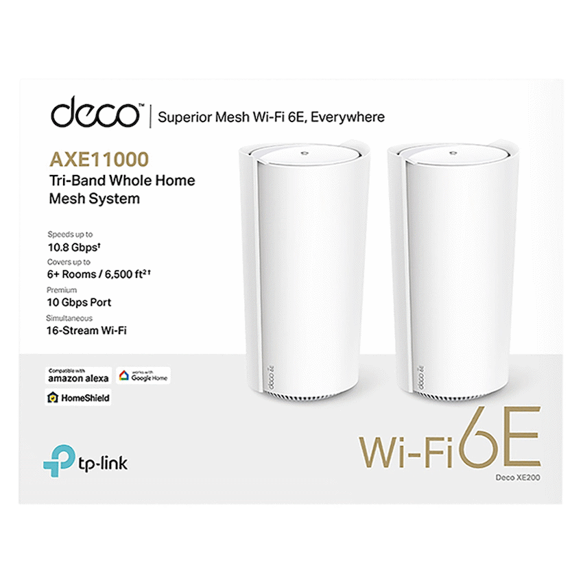 TP-Link Deco XE200(2-Pack) AXE11000 Whole Home Mesh Wi-Fi 6E System(Tri-Band)AXE11000 Tri-Band WiFi – 4804 Mbps (6 GHz) + 4804 Mbps (5 GHz) + 1148 Mbps (2.4 GHz).Works on the 6 GHz Band – Minimizes congestion with greenfield spectrum, delivering robust high-speed connections.16-Stream WiFi – Simultaneous data transmissions with 16 streams.Multi-Gig 10 Gbps Wired Network – 1x 10 Gbps port + 2x Gigabit ports.Boosted Seamless Coverage – Mesh WiFi coverage up to 6,500 ft2 (2-pack) and 3,300 ft2 (1-pack).Seamless AI-Driven Mesh – Intelligently learns your network environment to provide the ideal WiFi unique to your home.TP-Link HomeShield – Provides comprehensive network protection, robust parental controls, and real-time IoT security.Universal Compatibility – Backward compatible with all WiFi generations and works with any internet service provider (ISP) and modem.Setup Made Easier Than Ever – The Deco app walks you through setup step-by-step.