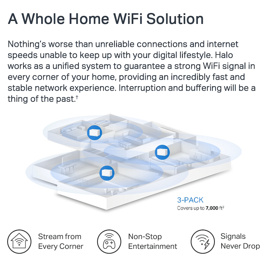 TP-Link Mercusys Halo H80X(3-Pack) AX3000 WiFi 6 Mesh SystemDual Band WiFi 6 Speeds up to 3000 Mbps – 2402 Mbps on 5 GHz and 574 Mbps on 2.4 GHz.Seamless Roaming with One Unified Network – Halo units work together to automatically switch between Halos as you move around your home with a single unified WiFi name and password.Whole-Home Coverage – Blanket up to 650 m2 with high-speed WiFi, eliminating WiFi dead zones at your home.Connect over 150 Devices – Provide fast and stable connections to over 150 devices.Easily Manage Your Home Network – Use the MERCUSYS App to quickly set up and manage your WiFi. You can also manage your kids’ online time and content.Full Gigabit Ports – 3x Gigabit ports per Halo unit for lightning-fast wired connections.*Please note that the Halo H series and S series cannot work together.