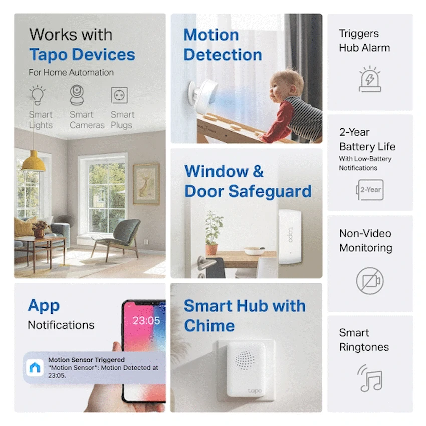 Give your home the smart protection it deserves with the TP-Link Tapo T30 Kit, a compact starter kit that combines motion sensing, door/window detection and hub alarm functions. It’s ideal for homes, apartments, or any entryway where you want real-time alerts and automation without installing cameras.At its core is the Tapo H100 hub, which connects to the app and acts as the central alarm and control point. The kit includes one T100 motion sensor and two T110 contact sensors (for doors/windows). Whenever motion is detected or a door/window opens, the hub triggers a built-in alarm (approx. 90 dB) and pushes a notification to your phone – keeping you aware no matter where you are.These smart sensors can also power automation. For example, opening a door could trigger lights, or motion in a hallway can turn on your smart bulbs – everything tied together under scenes you define in the Tapo app.With battery-powered sensors (no wires required) and support for low-power wireless protocols via the hub, devices in this kit are built for longevity – with estimated battery life up to 2 years.Setup is tool-free. You mount the sensors using 3M adhesive or magnetic mounts, plug in the hub, and connect everything via the app. It also supports local mode, so your sensors continue functioning within your home network even if the internet is down.