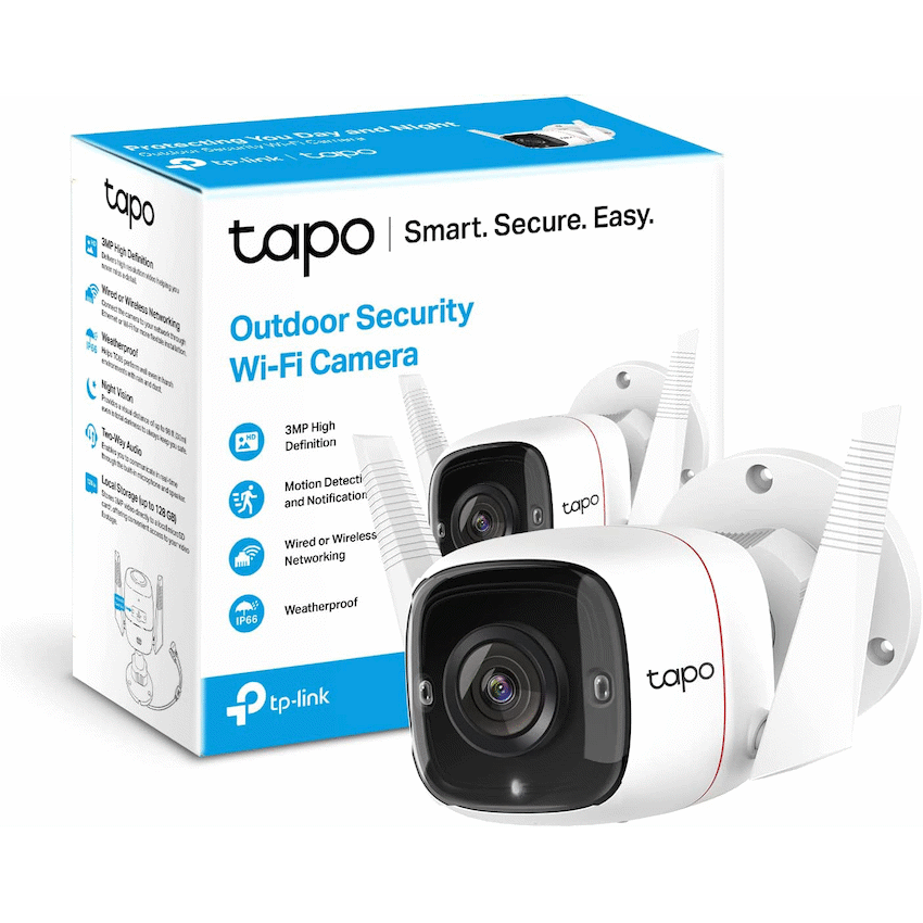 TP-Link Tapo TC65 3MP Outdoor Security Wi-Fi CameraUltra-High-Definition Video: Records every image in crystal-clear 3MP definition.Wired or Wireless Networking: Connect your camera to the network through Ethernet or WiFi for more flexible installation.Advanced Night Vision: Provides a visual distance of up to 98 ft (30m) even in total darkness.Motion Detection and Notifications: Notifies you when the camera detects movement.Sound and Light Alarm: Trigger light and sound effects to frighten away unwanted visitors.Two-Way Audio: Enables communication through a built-in microphone and speaker.Safe Storage: Locally stores up to 128 GB 3MP video on a microSD card, offering convenient access to your video footage.Voice Control: Free Up Your Hands with Voice Control: Works with the Google Assistant and Amazon Alexa. (Google Assistant and Amazon Alexa are not available in all languages and countries).