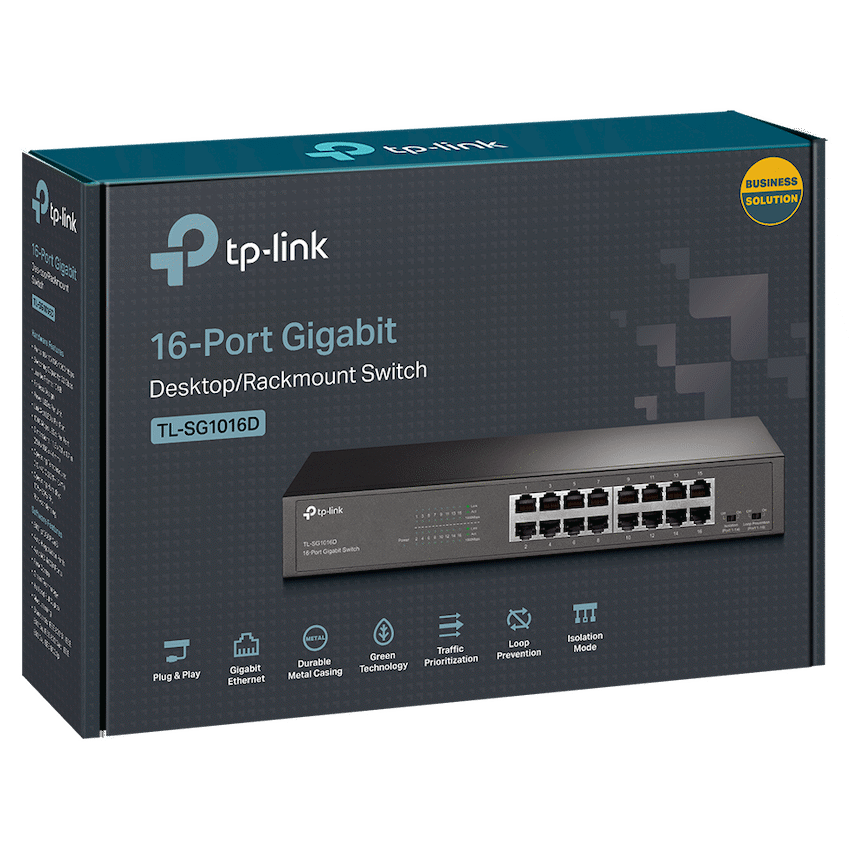 TP-Link TL-SG1016DE 16-Port Gigabit Easy Smart Switch is a dependable and cost-effective networking solution designed for small businesses, home offices, and expanding networks that require greater control than unmanaged switches without the complexity of fully managed solutions. Equipped with 16 auto-negotiation 10/100/1000Mbps RJ45 ports, it delivers fast, stable Gigabit Ethernet connectivity for computers, servers, network storage, printers, and other connected devices.This Easy Smart Switch offers essential management capabilities including network monitoring, traffic prioritization (QoS), and VLAN support, enabling users to optimize bandwidth allocation and improve overall network performance. These features are especially useful for bandwidth-sensitive applications such as VoIP, video conferencing, and HD streaming, helping ensure smooth and reliable data transmission.