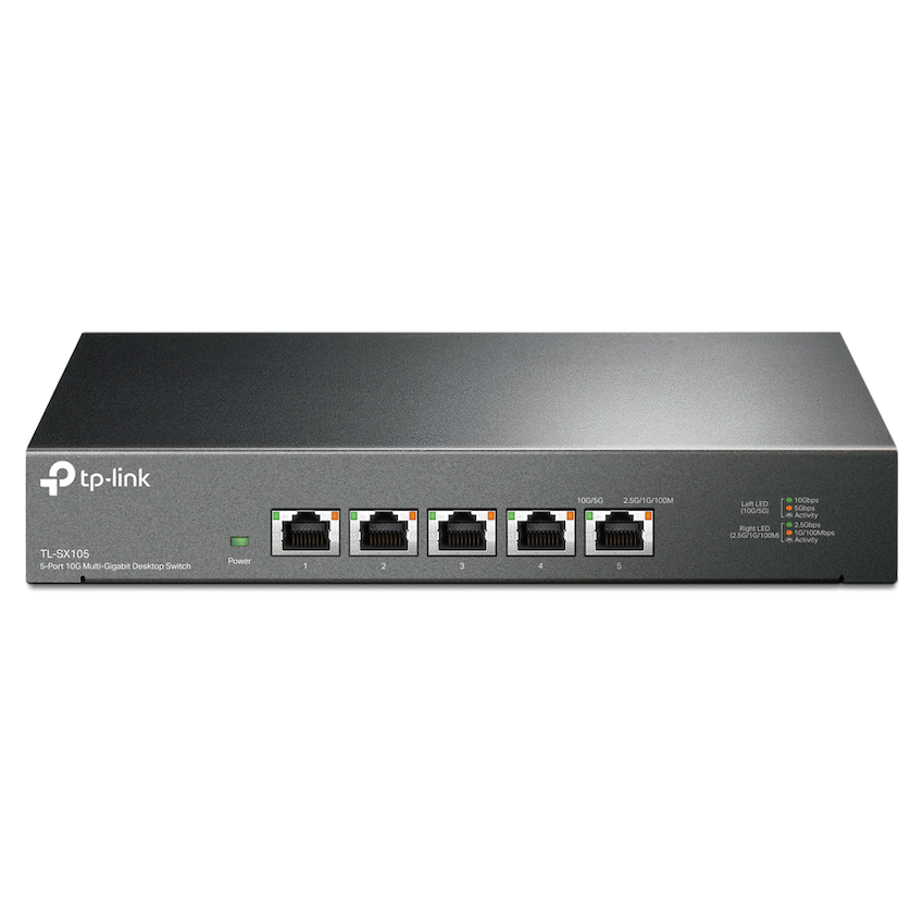 TP-Link TL-SX105 5-Port 10G Multi-Gigabit Desktop SwitchFive 10 Gbps Ports. 5x 10-Gigabit ports unlock the highest performance of your 10G/Multi-Gig bandwidth and devices, and provide up to 100 Gbps of switching capacity.Lightning-Fast Connections. Provides lightning-fast connections to 10G NAS, Server, 10G PCIe Adapter/ NIC, gaming computer, 2.5G/5G/10G WiFi 6 AP, 8K video, and more.Ideal for Various Scenarios. Built for lightning-fast connections in LAN parties, home entertainment, small and home offices, and workstations.Optimal 5-Speed Connections. Auto-negotiation for 5-speed (100Mbps/1G/2.5G/5G/10G) connections provide optimal performance.Silent Operation. The revolutionary fanless design ensures unprecedented silent operation, ideal for any home or business.Durable Metal Casing. Durable metal casing, desktop/wall-mounting, and professional heat dissipation design are well suited for different environments.Plug and Play. Allows for easy deployment without the need for a technician.