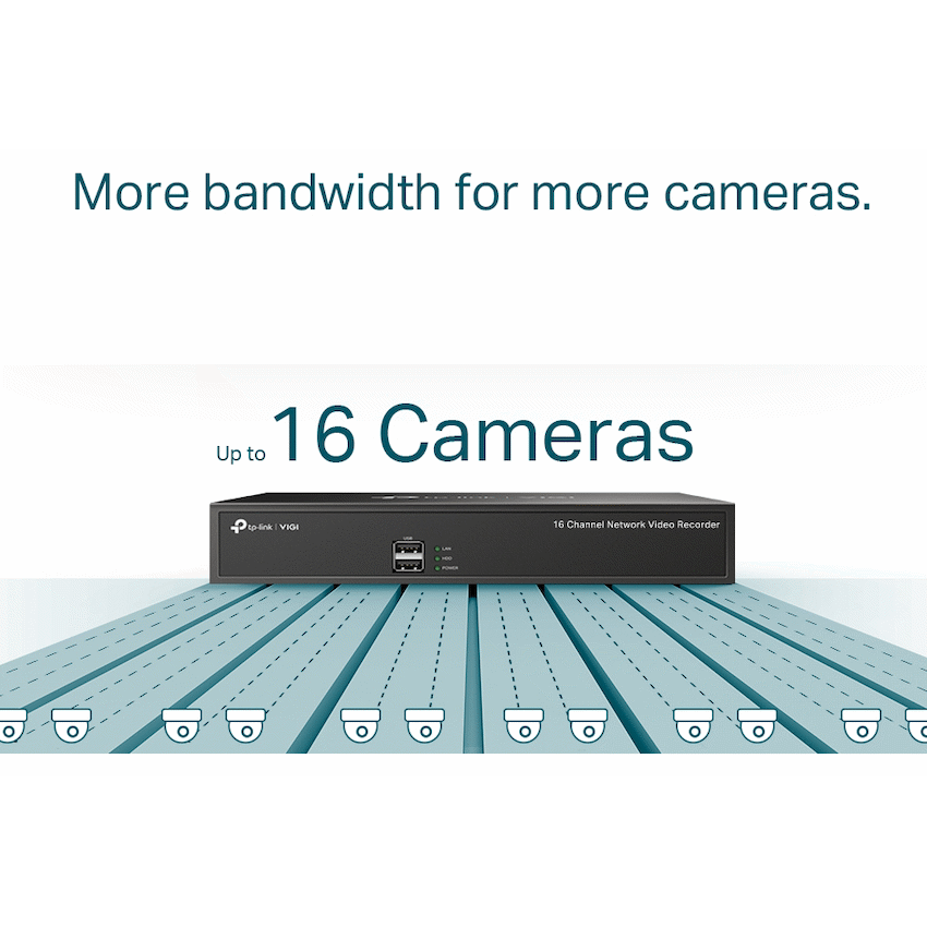 TP-Link Vigi NVR1016H 16 Channel Network Video Recorder24/7 Continuous Recording: Stores up to 10 TB of footage from connected cameras to secure your data for quick, convenient access.16-Channel Real-Time Live View: Sharp image definition up to 8MP and a 16-channel display ensures you capture every detail, from every angle.Quick Lookup and Playback: Find the target footage easily by date, event types, and tags. Replay with variable playback speeds to quickly review footage.Remote Monitoring: Dedicated VIGI app is developed for remote monitoring, providing ease and convenience.H.265+: Without using any extra bandwidth, your camera transmits compressed crystal-clear video to save disk space, ease network loads, and reduce monitoring costs without sacrificing image quality.ONVIF Ensure Compatibility*: Easily add IPCs from VIGI and other brands to establish a powerful and varied network thanks to barrier-free compatibility.1 HDD Interface (up to 10 TB)+: Stores up to 10 TB (720 days? of video) on a SATA hard drive, keeping your data storage secured locally.Two-Way Audio: With voice intercom support, carry two-way conversations while watching your feed from anywhere. Suitable for management.