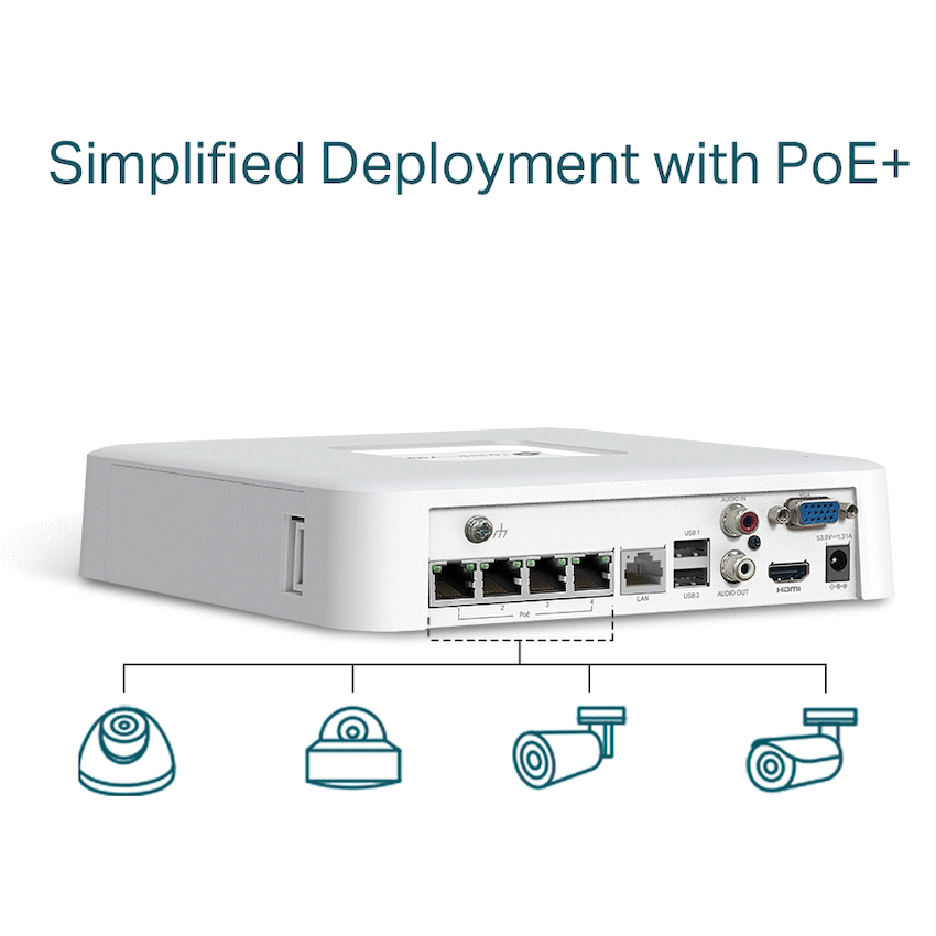 TP-Link Vigi NVR1104H-4P 4 Channel PoE Network Video Recorder4K HDMI Video Output & 16MP Decoding Capacity: Sharp image definition up to 8MP and a 4-channel display ensures you capture every detail, from every angle++.Simplified Deployment with PoE+: Easily connect and power your PoE camera with one RJ45 cable transmitting both data and power. No power adapter needed.Simple HDD Installation+: Install and remove the HDD manually with easy side access.4-Channel Simultaneous Playback? : Replay the feed from up to 4 cameras at the same time, increase replay speed, and find events in the video schedule to easily review footage.H.265+: Without using any extra bandwidth, your camera transmits compressed crystal-clear video to save disk space, ease network loads, and reduce monitoring costs without sacrificing image quality.ONVIF Ensures Compatibility*: Easily add IPCs from VIGI and other brands to establish a powerful and varied network thanks to barrier-free compatibility.Plug & Play: Allows new and unused VIGI IP Cameras to be added automatically to the new NVR and activated instantly, making installation faster than ever before.24/7 Continuous Recording: Stores up to 10 TB of footage from connected cameras to secure your data for quick, convenient access.Remote Monitoring: The dedicated VIGI app, web UI, and VIGI Security Manager enable remote monitoring, providing ease and convenience.Built-In Speaker: Enjoy real-time audio output without needing peripherals for greater convenience. Flexible Installation: Choose the suitable installation method by simply mounting your NVR on the wall, or placing it on or under a desk.